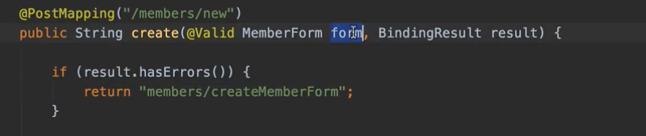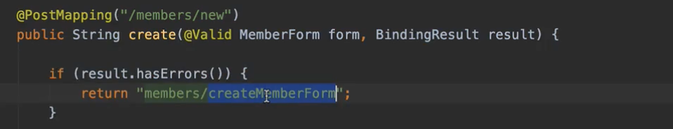 만약 result에서 hasError가 있으면, 그러니까 뭔가 error가 있으면 나는 return을 "members/createMemberForm"로 할 거야. 이렇게 해버리면 Spring이랑 thymeleaf가 인티그레이션이 되게 잘 돼있어요.