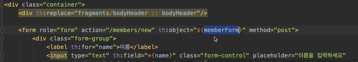 자 그러면 이거는 Thymeleaf에 있는 문법인데 th가 붙은 건 다 Thymeleaf 문법이에요. th:object="${memberForm} 라고 되어있는데, 이 form 안에서는 이 객체를 계속 쓰겠다는 거예요.