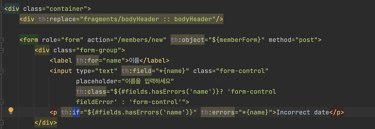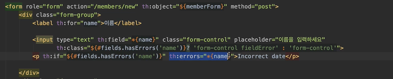 그래서 error가 있으면 if로 그 메시지 에러 중에서 name과 관련된 속성의 에러를 출력해라! 라고 타임 리프에서 이런 기능들 다 제공을 해줍니다.
