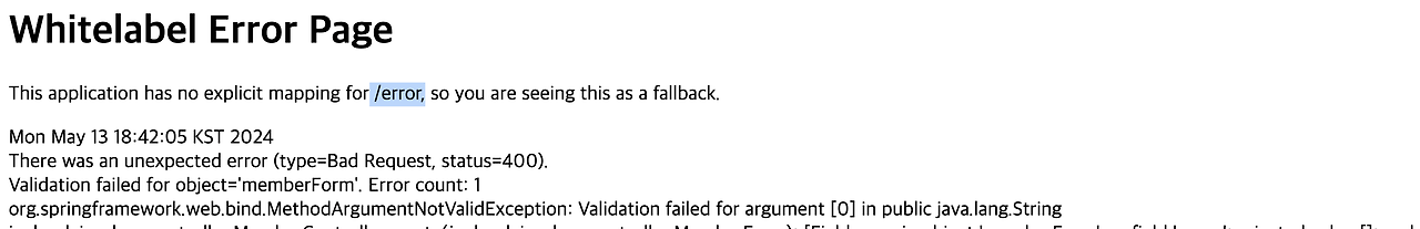 그러면 이렇게 Whitelabel Error Page가 나오면 보기가 좀 그렇잖아요. 제일 간지나는 거는 form으로 돌아가서 그 form에 '사용자 분께서 이름을 입력 안 하셨어요' 라고 해주는 게 제일 깔끔하겠죠.