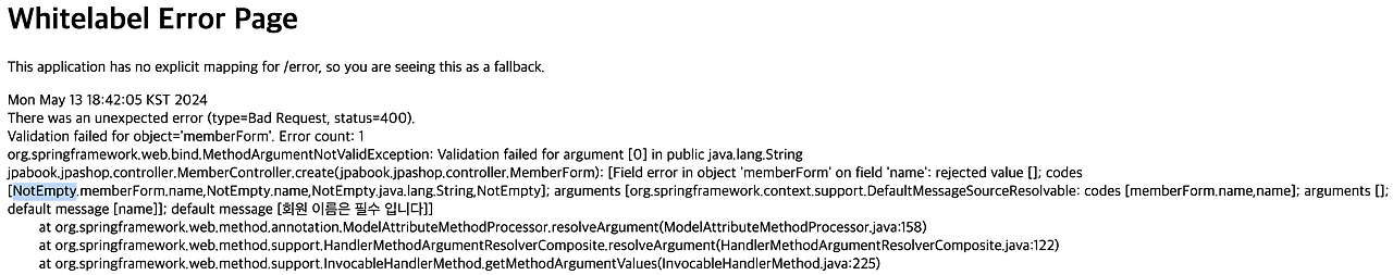 이 에러는 보나마나 지금 보면 NotEmpty가 걸렸다고 나오죠. 그러니까 우리가 파라미터에 적은 @Valid가 정확하게 인지가 되어서 동작했다는 얘기입니다.
