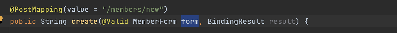 create 메서드에서 MemberForm이 Parameter로 넘어오게 돼요. 이렇게 넘어오는데 이제 뭐가 있냐면,