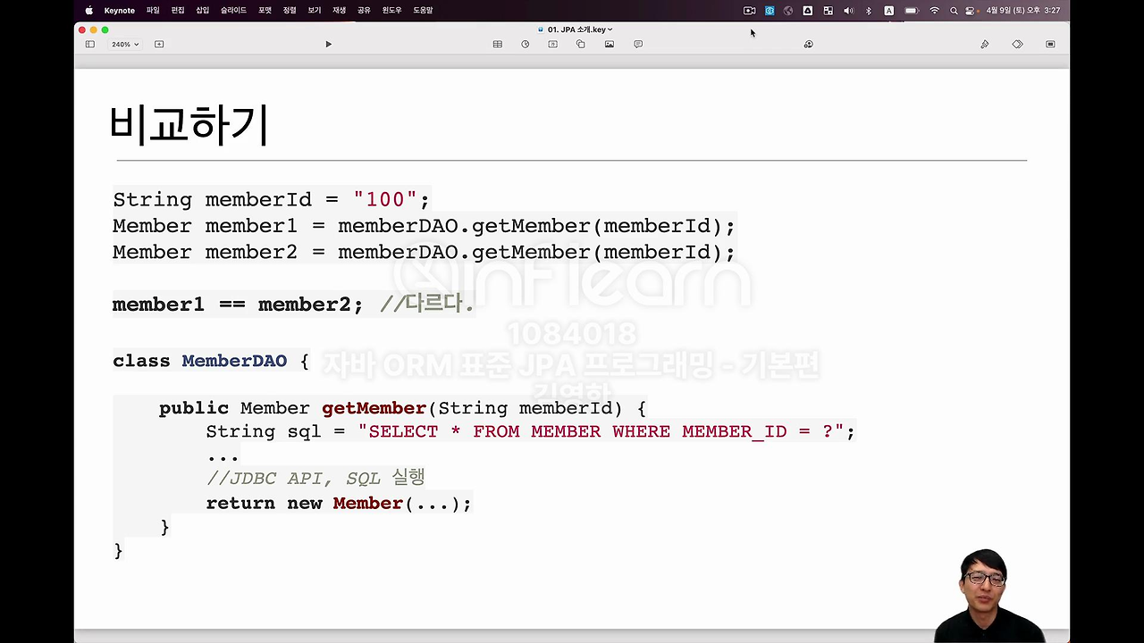 이거는 뭐냐면 우리가 일반적으로 SQL을 사용할 때는 이렇게 씁니다. 여러분 memberId가 100이라는 회원이 있어요. 그럼 이 100 이라는 회원을 제가 두 번 꺼내요. memberDAO.getMember() 해서 지금 두 번째 라인에서 100번을 넣어서 member1번을 꺼냅니다. 그 다음에 memberDAO.getMember() 해서 또 100번을 넣어서 member2번을 꺼냅니다. 그 다음에 우리가 == 비교라고 하죠. == 비교를 했을 때 이 인스턴스가 같을까요, 다를까요?