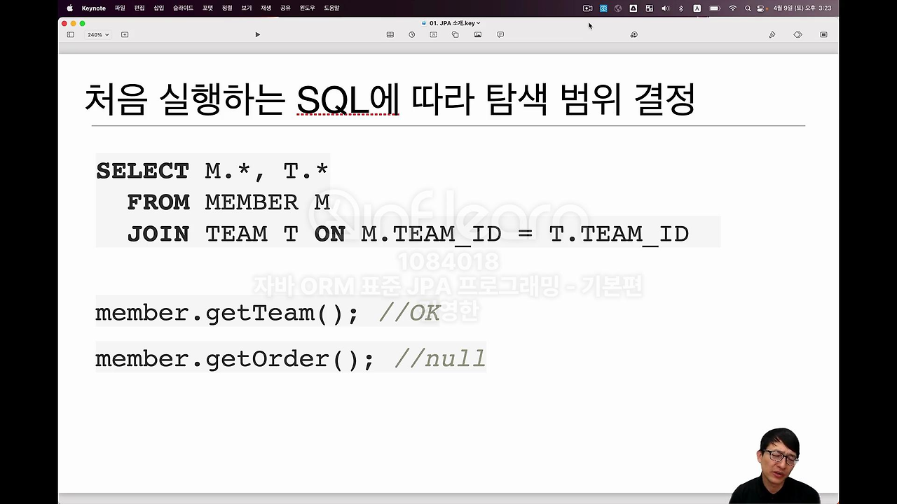 물론 Member 안에 order라는 필드가 있습니다. 그런데 member.getOrder() 하면 거기는 null이겠죠. 왜냐면 내가 DB에서 조회를 안 했잖아요. 처음 실행하는 SQL에 따라서 이 탐색 범위가 딱 결정이 돼버려요.