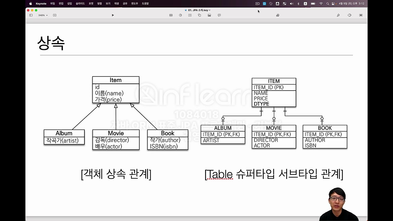 그림 오른쪽 Item을 보시면 ITEM_ID, NAME, PRICE 라고 되어있죠. 그러니까 부모같은 테이블을 만드는 거에요. 그리고 자식같은 테이블을 아래에다가 만드는 거죠. 이렇게 해서 데이터를 딱 분리해놓고, 필요할 때는 join해서 가지고 오고 약간 이렇게 푸는 건데, 이거를 뭐라 그러냐면 데이터베이스 테이블 설계 기법 중에 하나인데 슈퍼타입, 서브타입 관계라고 합니다.