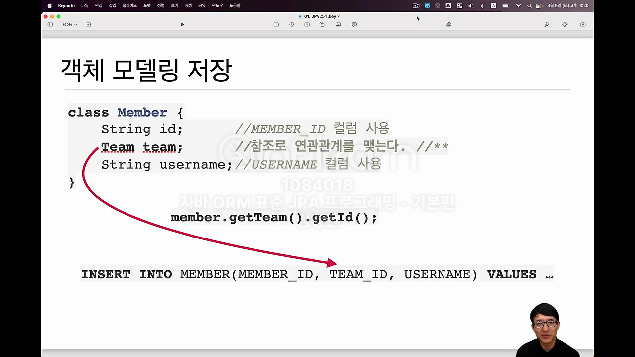 이렇게 객체 답게 모델링을 하게 되면 데이터베이스에 insert 하기가 굉장히 까다로워집니다. insert 쿼리를 만들 때 이렇게 짜야돼요.