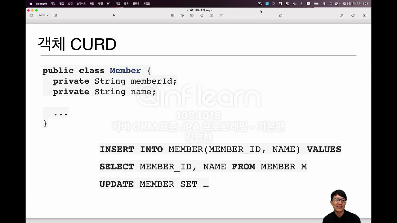 그래서 Java 객체를 SQL로 바꾸고, SQL을 Java 객체로 바꾸고 이런 과정들을 계속 무한 반복해야 됩니다. 예를 들어서 회원 하나만 그러는 게 아니라 상품이 있다, 주문이 있다 그러면 그것마다 CRUD를 다 만들어야 되겠죠.