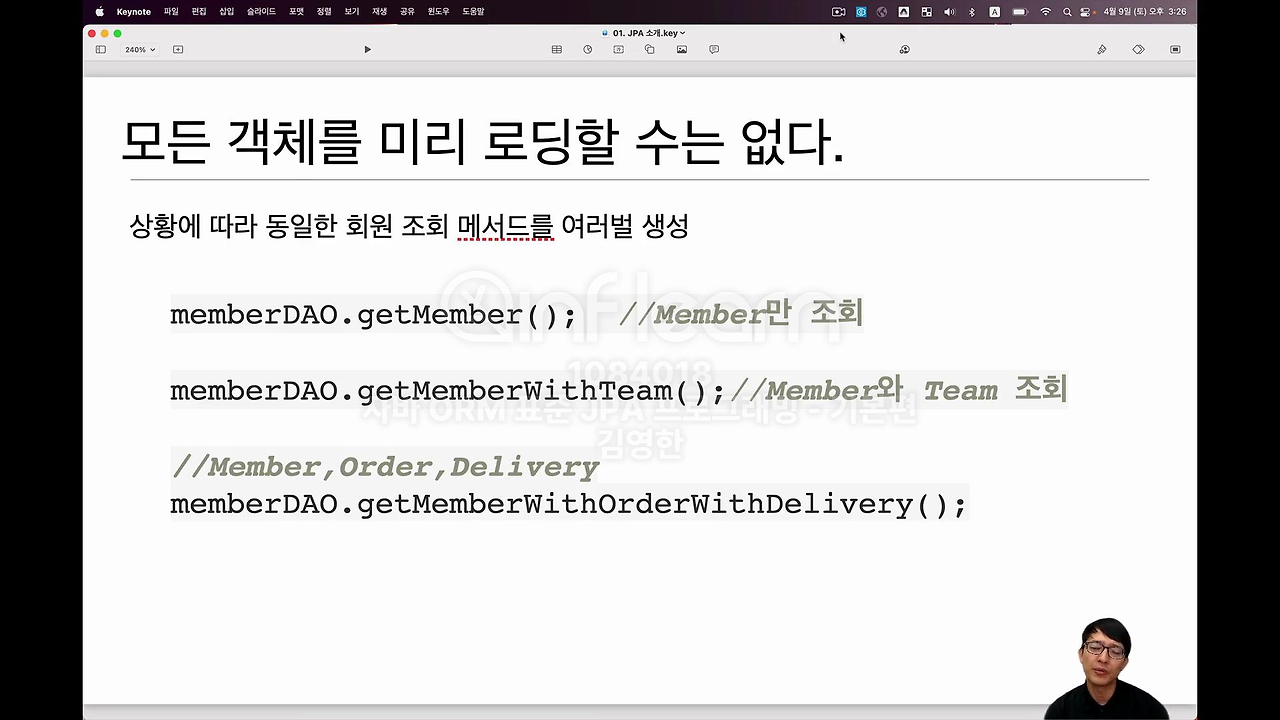 자 여러분 여기까지는 괜찮은데 이 케이스가 지금 한 두개가 아니잖아요. Member랑 Order, Delivery 다 조회해야되면 memberDAO.getMemberWithOrderWithDelivery() 이렇게 짜야되는거에요. 그렇다고 모든 객체를 미리 로딩할 수는 없죠.