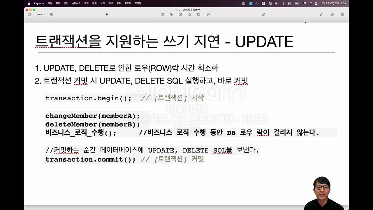 JPA도 똑같아요. 이렇게 해서 그냥 member.setName()만 하면 돼요. 뭐 보통 생각할 땐 'jpa.update() 이런 게 있지 않나요?' 하실 수 있는데 그냥 setName()으로 됩니다. 물론 조건이 있어요. 트랜잭션 안에서 이 데이터를 조회한 다음에 데이터를 변경해주면 트랜잭션이 끝난 시점에 자동으로 Update 쿼리가 DB에 나가게 됩니다. 그게 나간 다음 데이터베이스를 커밋하게 되죠.