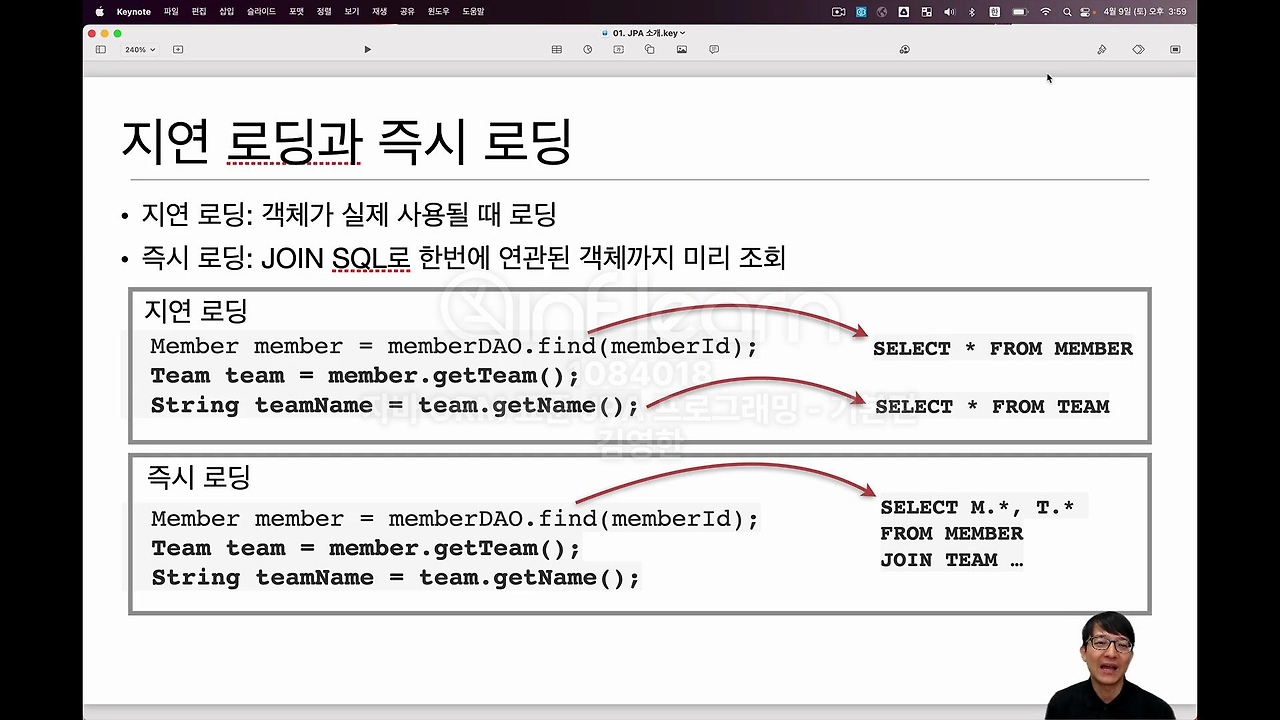 이런 게 왜 중요하냐면 우리가 애플리케이션 개발할 때 성능 최적화는 나중에 고민해도 되잖아요. 그래서 JPA 개발할 때는 보통 지연 로딩으로 쫙 세팅을 해놓다가 나중에 성능을 보고 하나의 쿼리로 하는 게 좋을 것 같다 그러면 거기만 즉시 로딩으로 약간 설정만 다다닥 해주면 되거든요. 아무튼 그런 식으로 최적화가 가능합니다.