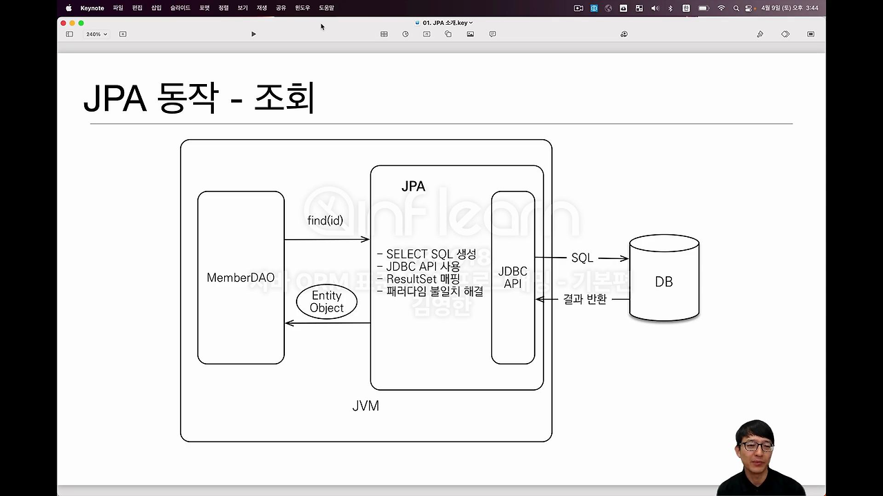 jpa에게 그냥 id만 던지면 돼요. '회원 id 10번 찾아주세요' 라고 하면 jpa가 어떻게 하냐면 select 쿼리를 다 만듭니다. 그러니까 그 회원 객체를 분석을 해서 select 쿼리를 다 만들고, JDBC API를 사용하고 ResultSet 다 맵핑해주고, 그리고 패러다임의 불일치까지 해결합니. 뒤에 말씀드릴 건데 상속이나 이런 것들에서 어떤 문제점들을 다 해결해 주고요 그렇게 해가지고 조회니까 JPA가 entity object를 다 만들어서 우리에게 딱 반환을 해줍니다. 굉장히 깔끔하죠.