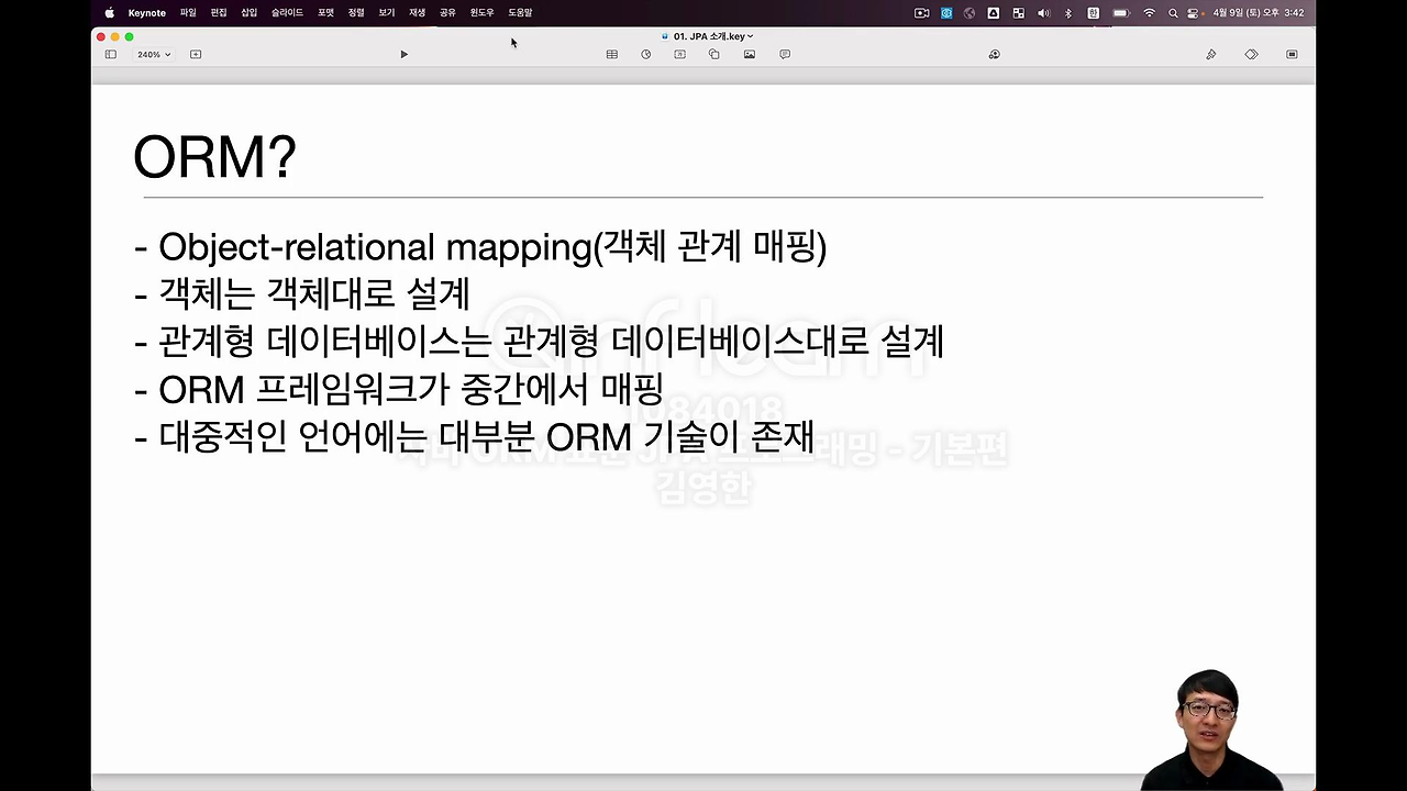 JPA는 뭐냐면 Java Persistence API 라는 것의 줄임말인데요. 이게 Java 진영의 ORM 기술 표준입니다. 그러면 '어? ORM은 뭐지?'