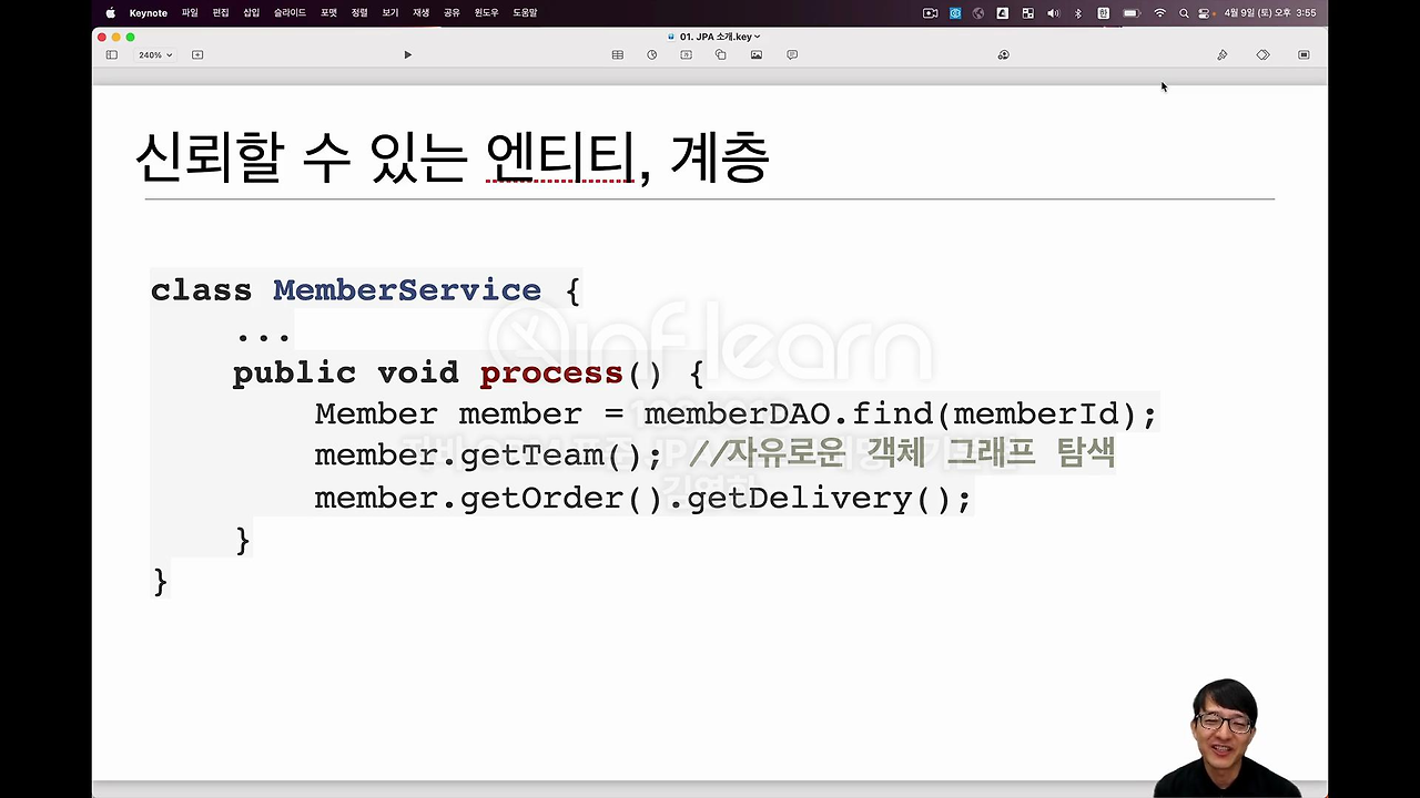 자 그리고 엔티티 계층을 신뢰할 수가 있어요. 이전에 SQL을 직접 다룰 때는 신뢰하기 어렵다 했죠. jpa는 memberDAO가 내부에서 jpa를 쓴다고 가정을 할게요. 그러면 여기서 Member 객체를 딱 반환을 받아요. 그러면 JPA에서는 JPA가 관리하는 이 객체를 엔티티라고 하거든요. 그 다음에 어떻게 하느냐? member.getTeam(), member.getOrder().getDelivery() 할 수 있습니다. 물론 데이터가 다 그 안에 데이터가 있다는 전제하에 데이터가 다 존재하게 됩니다.