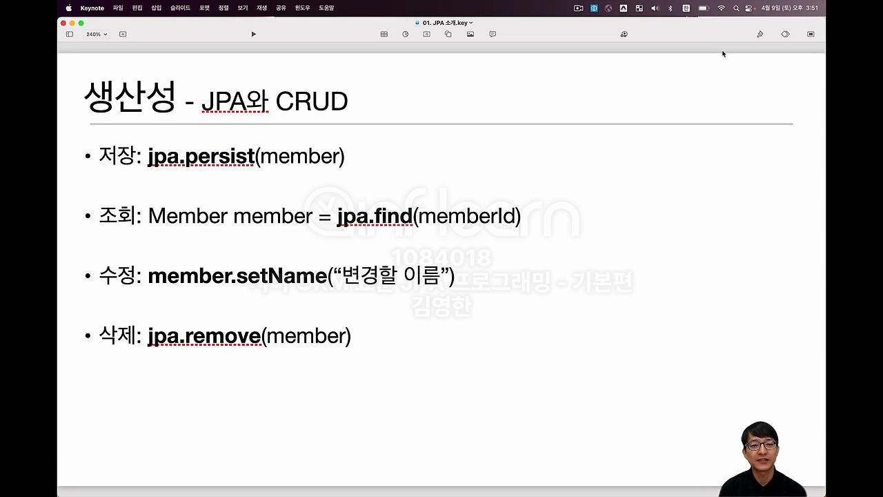 제일 먼저 생산성 관련해서는 여러분 그냥 코드를 이렇게 짜는 거예요. Member 객체를 저장해야 된다고 하면, jpa.persist() 하면 돼요. persist 라는 뜻이 뭐냐면 뭐 영구 보관하다, 이런 뜻이거든요. 그래서 jpa.persist(member)를 하면 마치 Java Collection에다가 저장하듯이 저장이 됩니다.