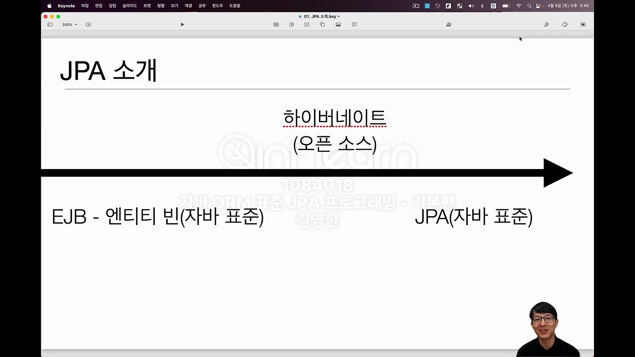 여러분 옛날에 EJB라는 게 있었어요. 자바 진영에서 EJB라는 게 있었는데 이게 이제 크게 두 가지 기능이 있었어요. 우리가 지금 스프링에서 사용하는 컨테이너 기술 같은 EJB 영역이 있었고, 그 다음에 지금의 JPA라고 볼 수 있는데, 엔티티 빈이라는 게 있었어요. 그래서 JPA는 이 엔티티 빈으로부터 출발을 한 거고요.