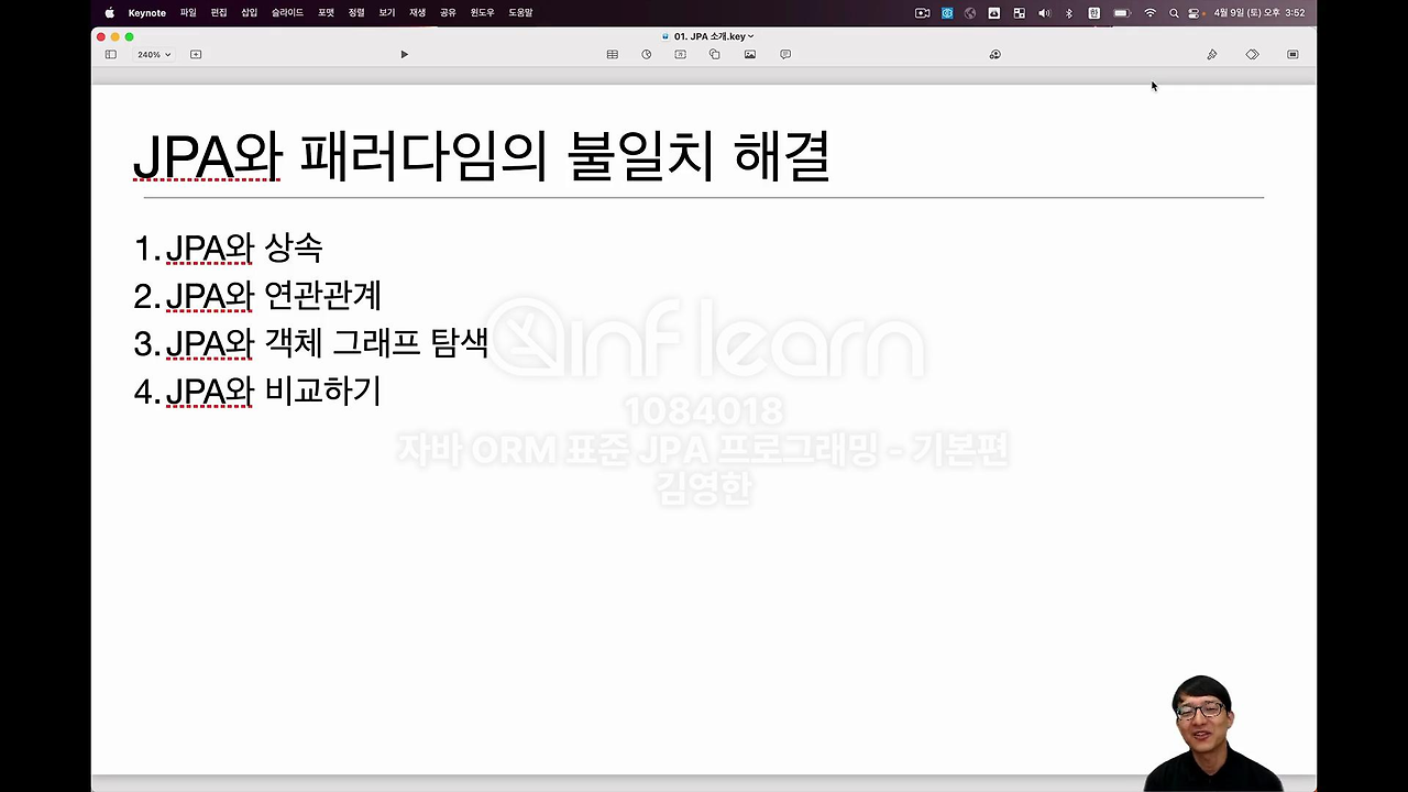 자 그리고 사실은 이게 더 중요한데요. jpa가 paradigm의 불일치를 해결을 해줍니다. 상속, 연관관계, 객체 그래프 탐색, 비교하기, 앞에서 제가 설명드렸던 그 4가지를 다 해결을 해줍니다.