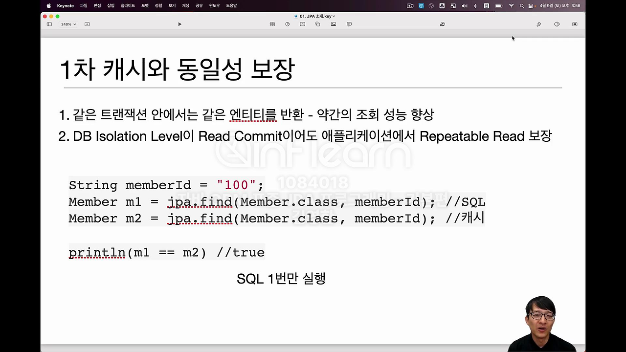 그래서 이거는 약간 캐싱과 관련된 건데 이전에 말씀드렸듯이 jpa에서는 같은 Member를 조회하게 되면, 첫 번째에서는 로직에서 jpa.find 에서 100번을 넘겨요. 그럼 첫 번째는 SQL query가 나갑니다. 그래서 가지고 와요. jpa가 중간에 그걸 들고 있어요. 그 다음에 jpa.find 하면 이제는 jpa가 sql을 날리지 않고 jpa가 메모리 상에서 들고 와서 반환을 해줍니다. 그래서 == 비교하면 같다고 나오고, 두 번 같은 회원을 조회했지만 sql은 한번만 실행이 됩니다.