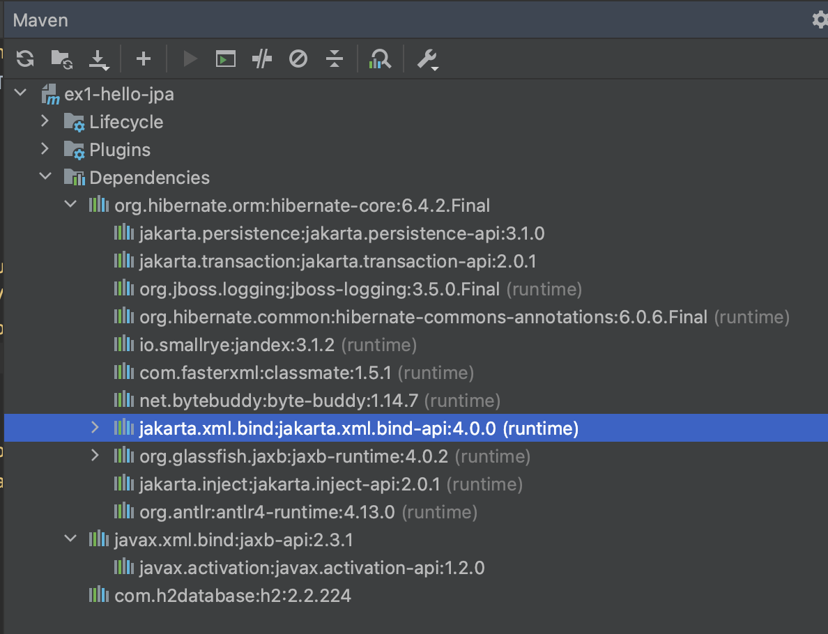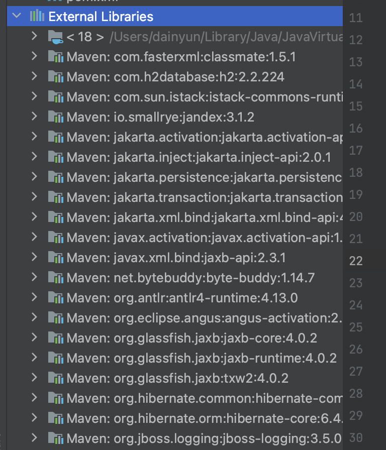 지금 보면 어떤 건 jakarta로 시작하고 어떤건 Hibernate로 시작하죠. 이게 뭐냐면 jakarta로 시작하는 건 제가 지난 시간에 설명드린 JPA 자체라는 게 표준이어서 구현체로 Hibernate도 있고 EclipseLink 라는 애도 있고 여러가지가 있다고 그랬죠. 그래서 jakarta 라는 것은 내가 이 Hibernate 라이브러리 말고 다른 jpa 구현 라이브러리를 써도 그대로 적용이 돼요. 근데 이건 표준을 지키는 거고요.