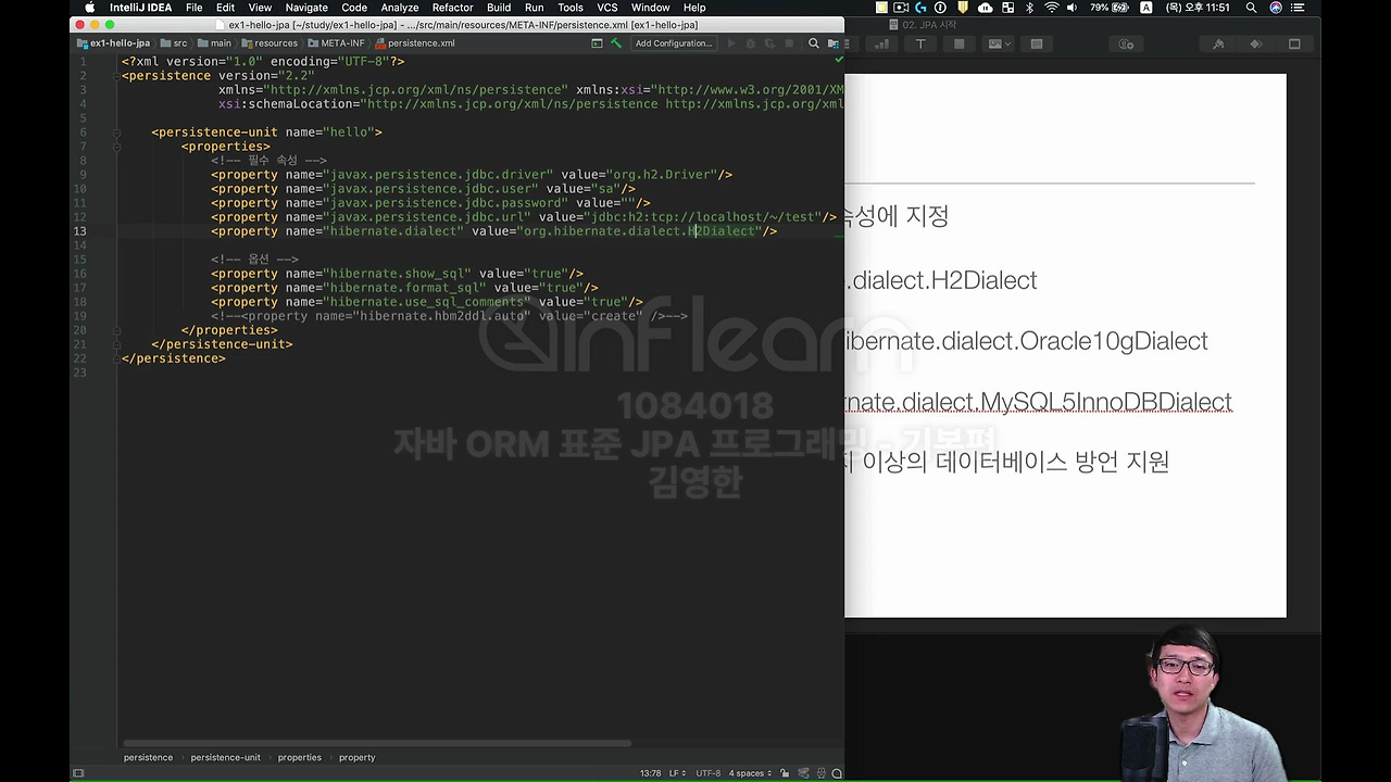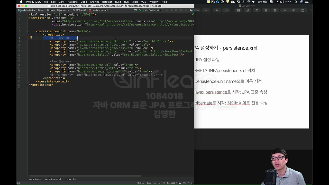강의 기준 상 여기 Persistence 버전 2.2 지금은 JPA 2.2를 쓰신다고 보시면 되구요. 그 다음에 몇 가지가 있는데, 이 JPA를 쓸 건데 네가 이름을 뭘 쓸 거야? 하는 거구요.