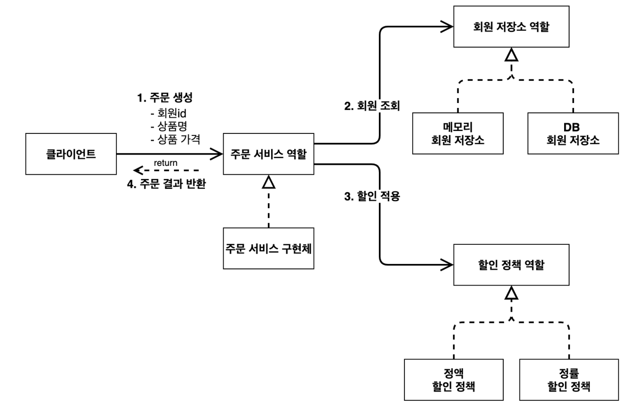 클라이언트가 주문할 때 생각해보시면, 주문 서비스 역할이 있었고, 주문 서비스 역할은 또 회원 저장소 역할이 있고, 할인 정책 역할이 필요했죠.