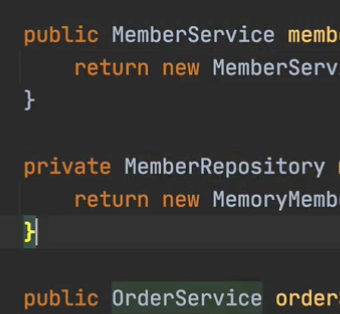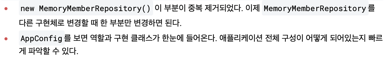 new MemoryMemberRepository() 이 부분이 중복이 있었는데 제거되었죠. 이전에는 다른 리포지토리로 바꾸려면 중복된 부분을 모두 바꿨어야 했는데, 이제는 MemoryMemberRepository를 다른 구현체로 변경할 때
