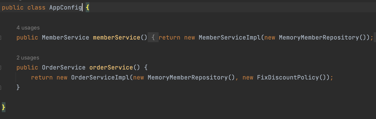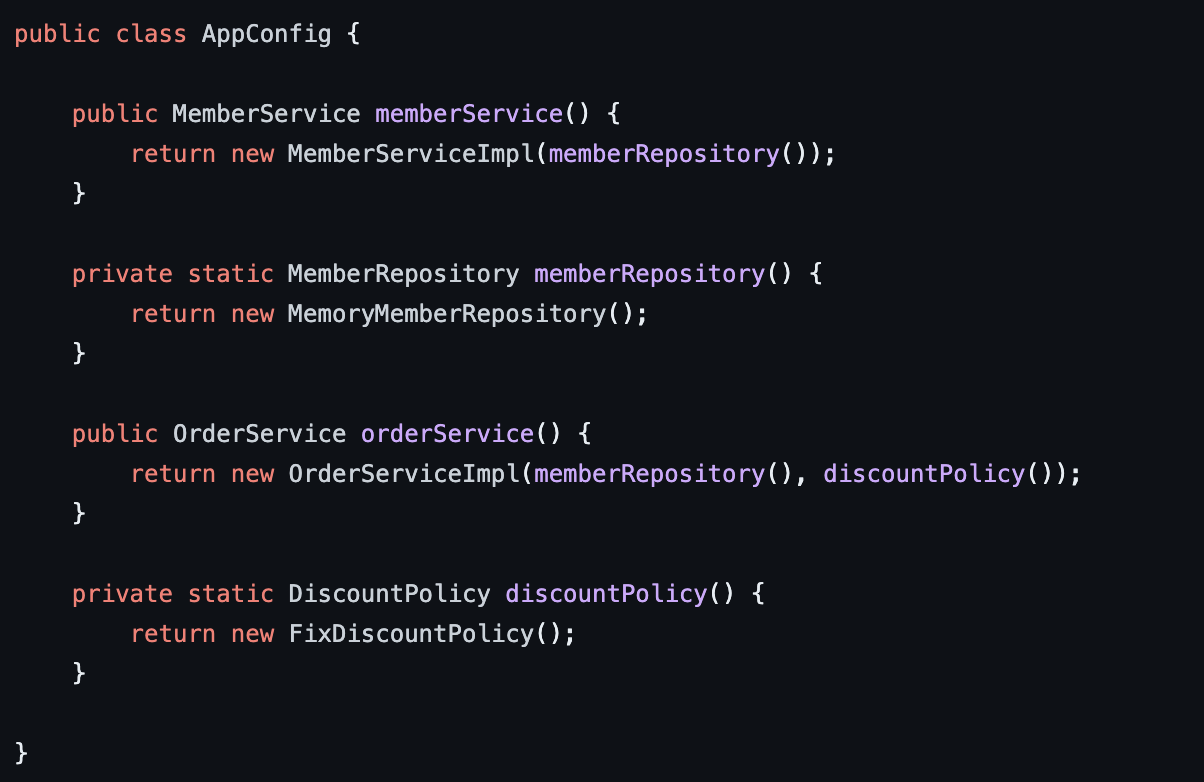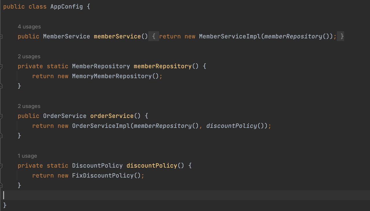 이번 시간에는 AppConfig를 리팩터링을 해볼게요. 현재 AppConfig를 잘 보시면, 중복도 좀 있고 역할에 따른 구현이 잘 안보여요.