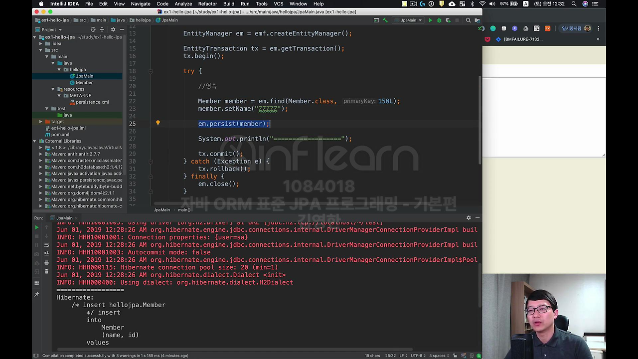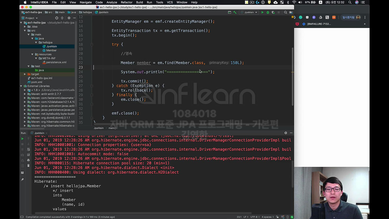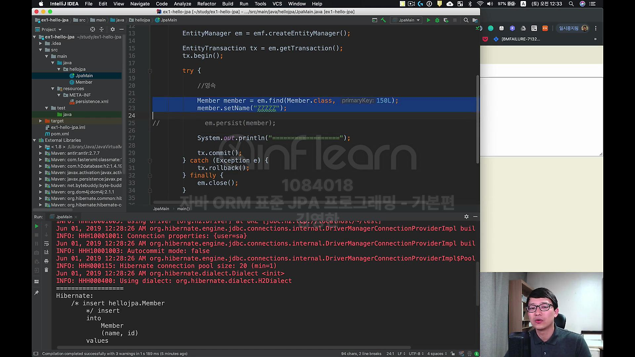 자 em.persist로 저장된 거를 제가 조회해 볼게요. 지금 DB에 100L 값이 있어서 101로 값을 좀 바꾼 다음에 저장을 하고 조회해 볼게요.