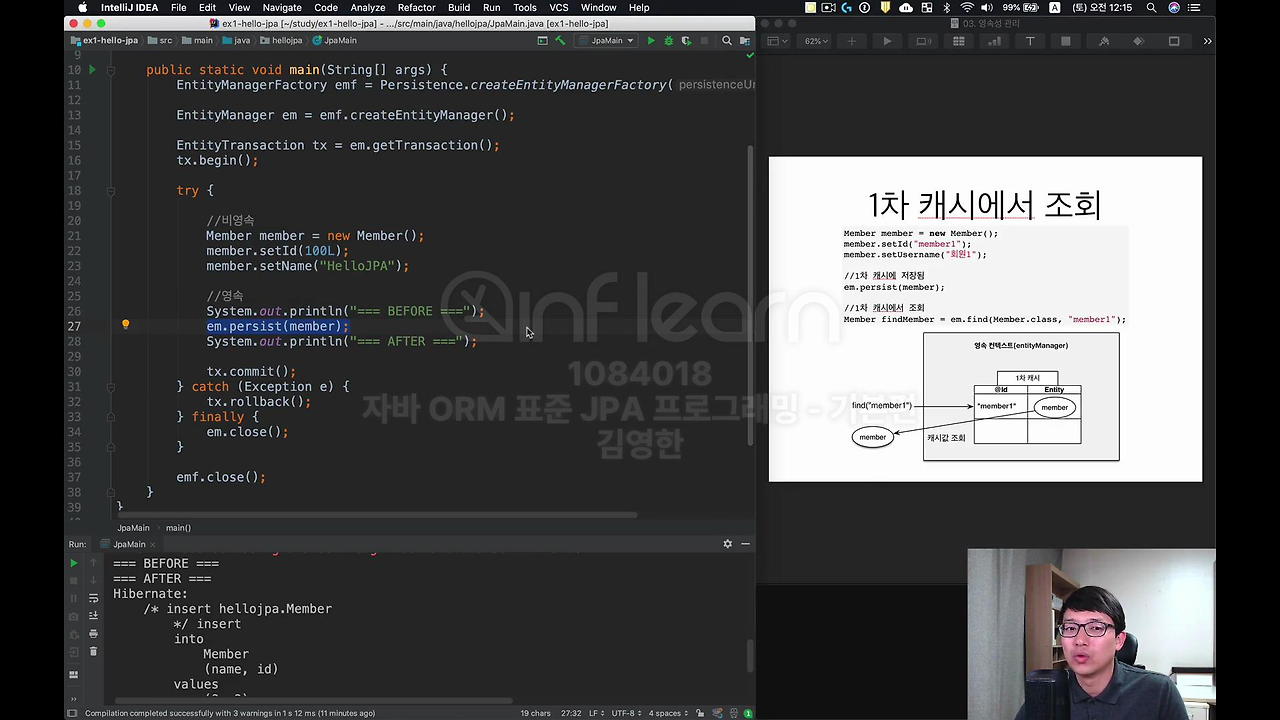 자 그리고 지금 만든 Member 객체를 em.persist 해서 딱 집어 넣으면 무슨 일이 발생하냐면, 여기 영속성 컨텍스트 보이시죠.