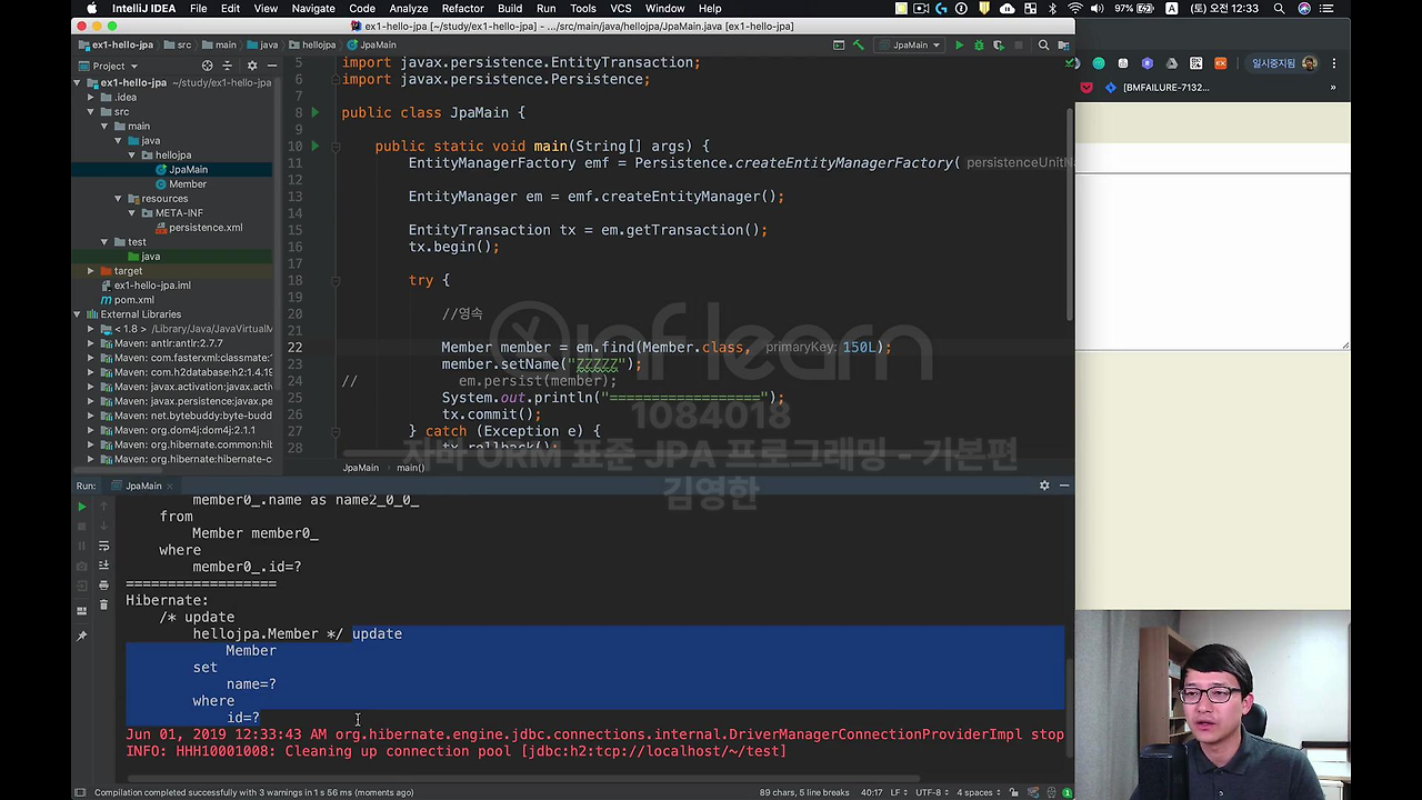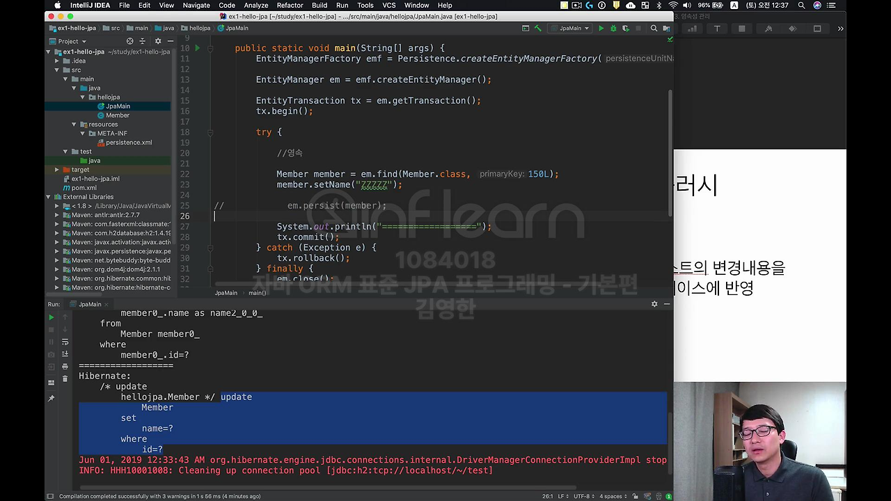 원래 보통은 데이터 변경하면 다시 데이터베이스에 반영을 해줘야 되잖아요. 근데 여러분 이거 잘 생각해 보면 제가 가장 처음 첫 시간에 설명 드렸을 것 같은데 이 JPA의 목적이 마치 Java 컬렉션 다루듯이 객체를 다루는 거거든요. 그래서 컬렉션에 넣은 것처럼 생각해보면 우리가 뭐 Java 리스트 같은 컬렉션에서 값을 꺼냈어요. 그리고 내가 값을 변경했어. 그 다음에 다시 컬렉션에 집어 넣었나요? 그렇지 않거든요.