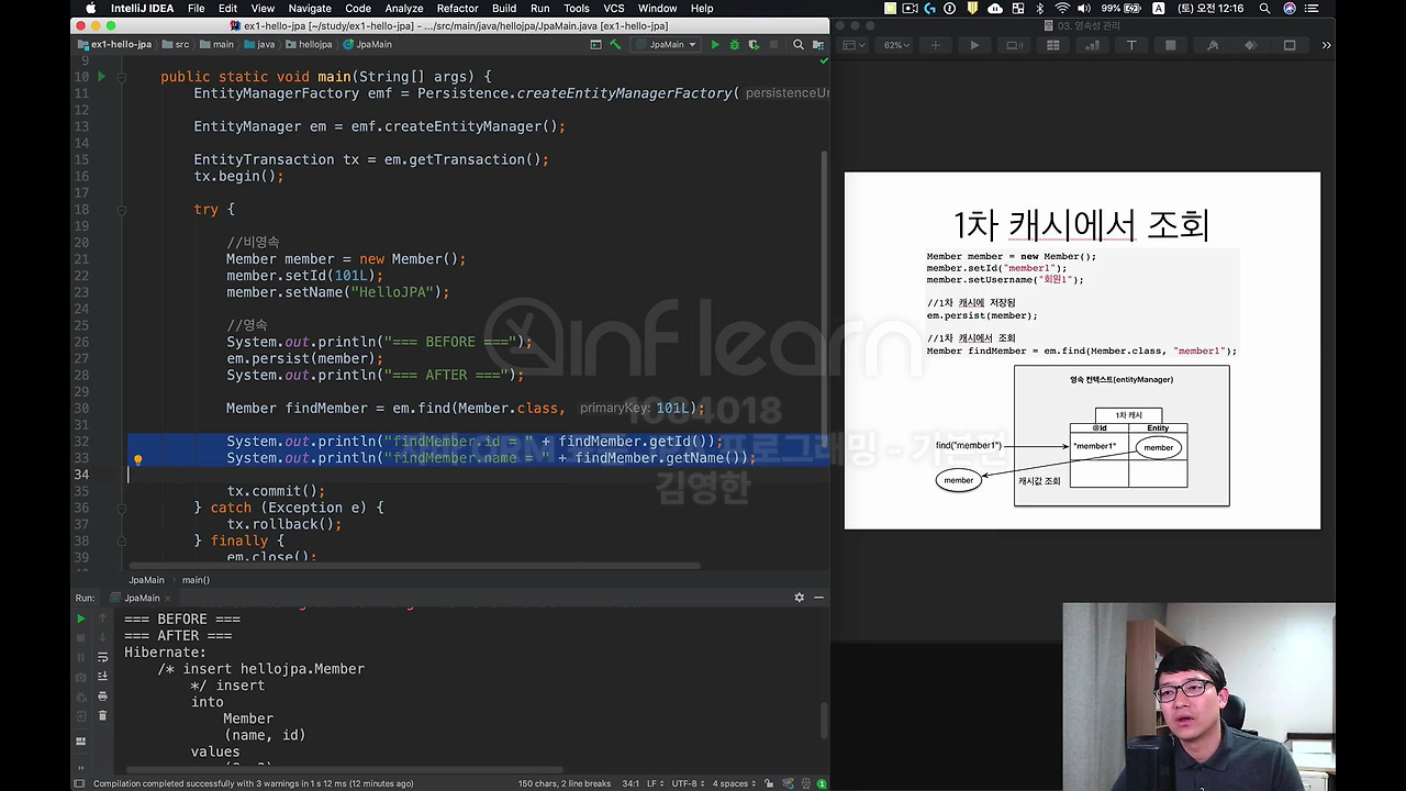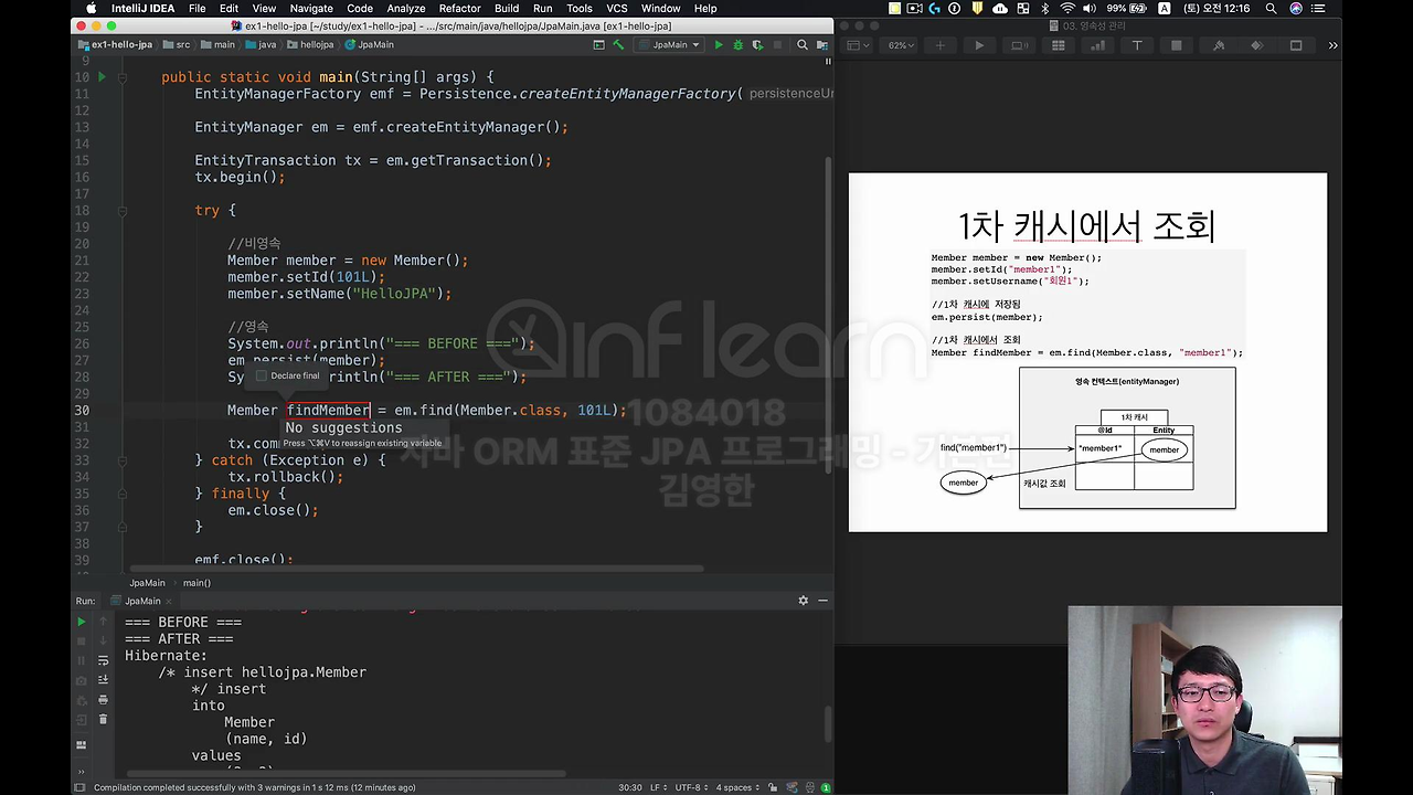 그래서 1차 캐시에 보니까 Member 엔티티가 있네? 그럼 캐시에 있는 값을 그냥 조회해옵니다. 그래서 이런 1차 캐시에서 조회한다는 이점이 있습니다.