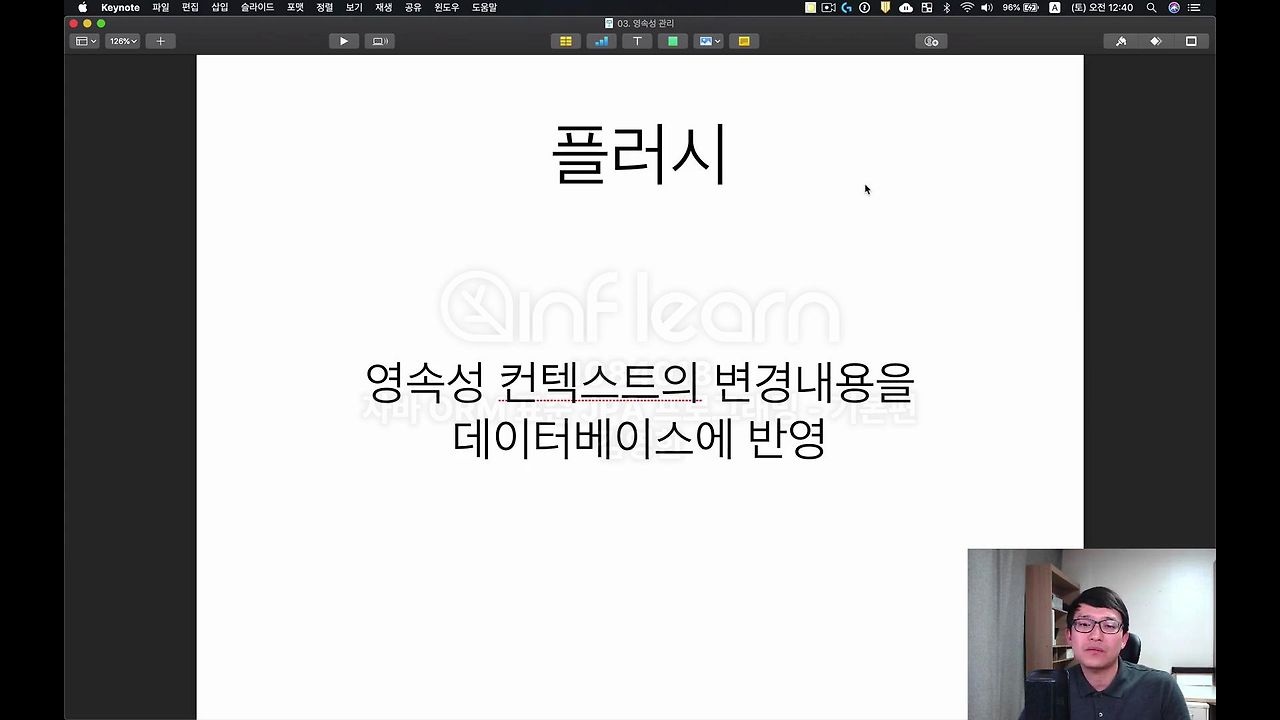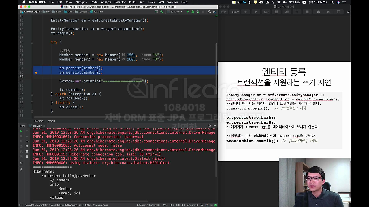 이 persist 하는 순간에 데이터베이스에 저장되는 게 아니라 그냥 영속성 컨텍스트에 차곡차곡 엔티티도 쌓이고 쿼리도 쌓이게 됩니다. 그러다가 딱 커밋을 하는 시점에 진짜 데이터베이스의 쿼리가 딱 날아가게 됩니다.