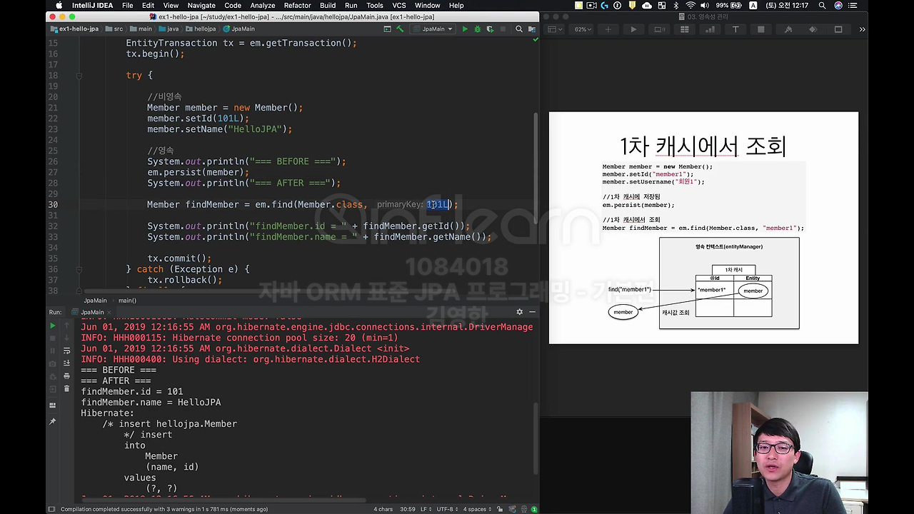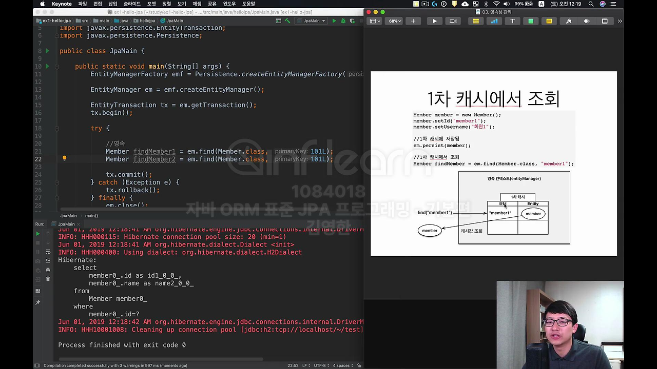 여기서 저장을 할 때 어디에 저장이 된다 했죠? 1차 캐시에 저장이 된 거예요. 그리고 나는 똑같은 PK로 값을 가져왔기 때문에 DB에서 가져오는 게 아니라 먼저 1차 캐시에 있는 거를 조회한 거죠.