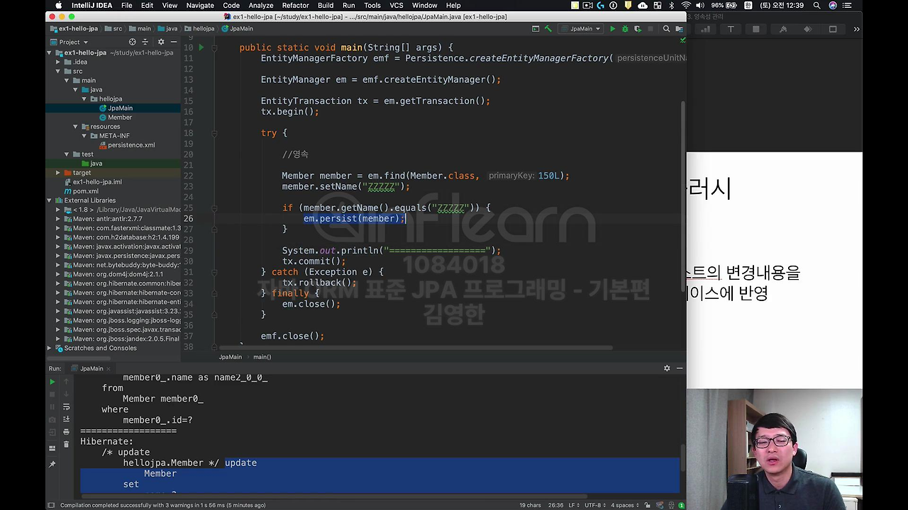 이렇게 setName으로 "ZZZZ"으로 이름을 변경할게요. 여기서 JPA 처음 쓰시면, 이런 이론적인 부분을 모르면 이 부분을 되게 헷갈려 하세요.