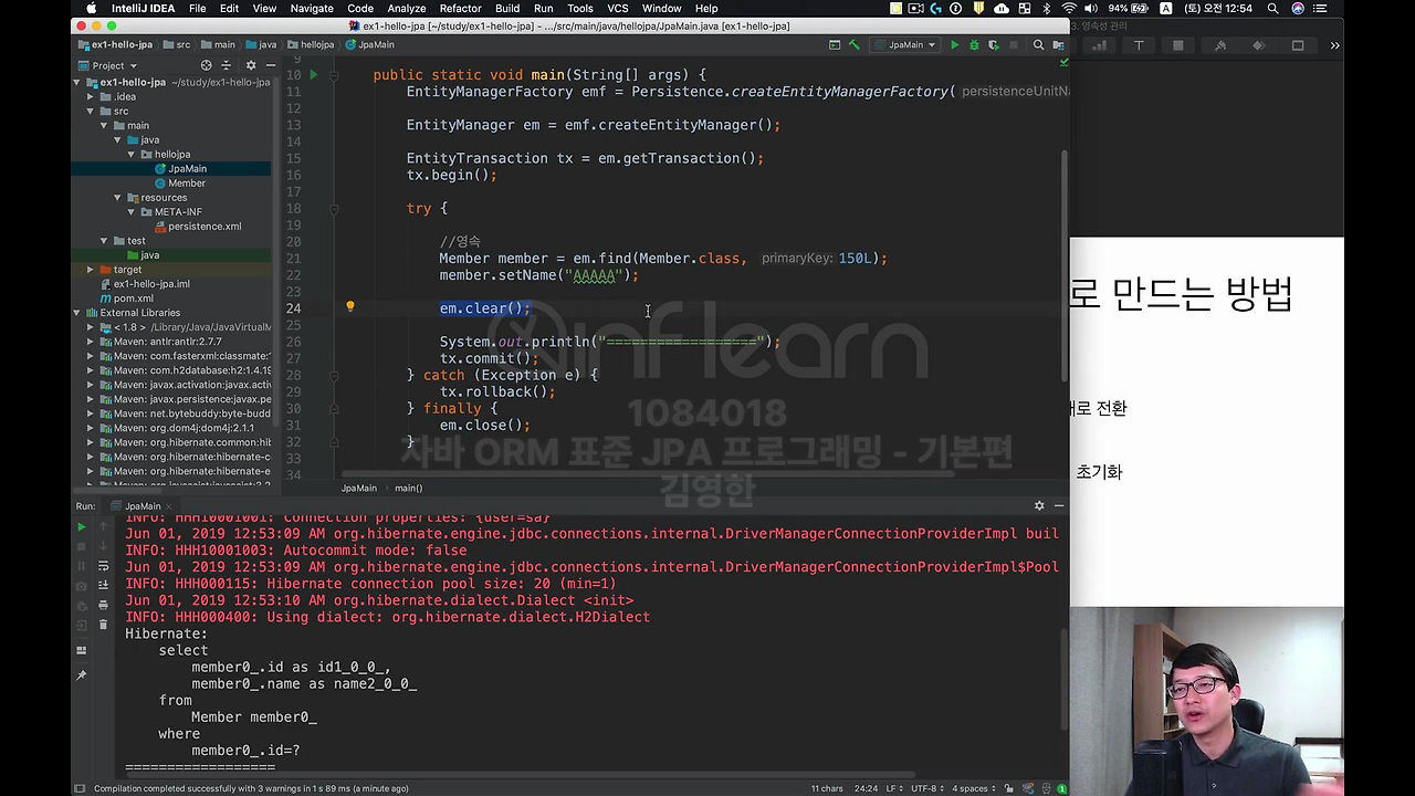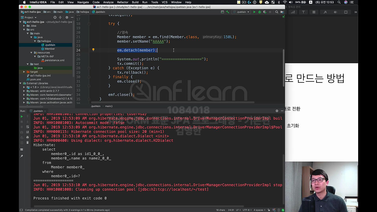 자 그 다음 em.close() 해서 영속성 컨텍스트를 닫아 버려요. 그럼 당연히 member는 더 이상 관리가 안 되겠죠. 데이터를 변경해도 변경이 안 될겁니다. update 쿼리가 안 날라가니까요.
