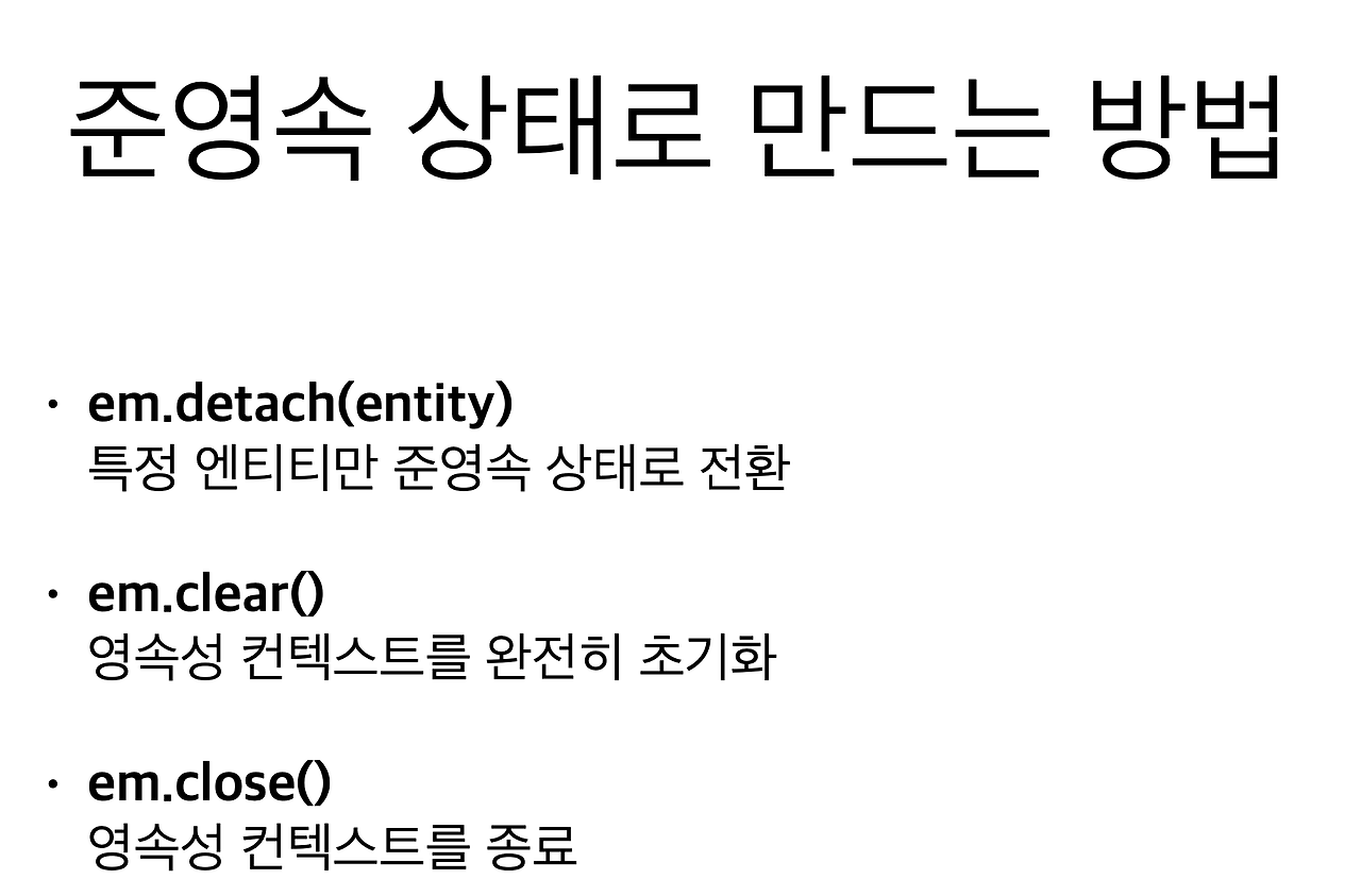 이렇게 이 세 가지 방법으로 엔티티를 준영속성 상태로 만들 수가 있습니다.