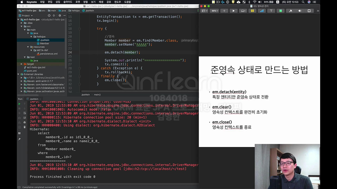 이거를 사실 내가 직접 쓸 일은 거의 없구요. 나중에 웹 어플리케이션 개발하거나 이럴 때, 좀 복잡할 때는 '아 이게 이래서 되는구나' 하고 이해하실 수 있어요. 지금은 이론적으로 이렇구나. 정도만 알아두시면 됩니다. 그러면 이렇게 영속 상태였다가 영속성 컨텍스트에서 빠진 상태를 이제 준영속 상태라고 해요. detach된 상태라고 얘기하는데 옛날에는 주로 준영속 상태라고 많이 불러서 저도 그렇게 부릅니다. 암튼 이 준영속 상태로 만드는 방법은 뭐냐면,