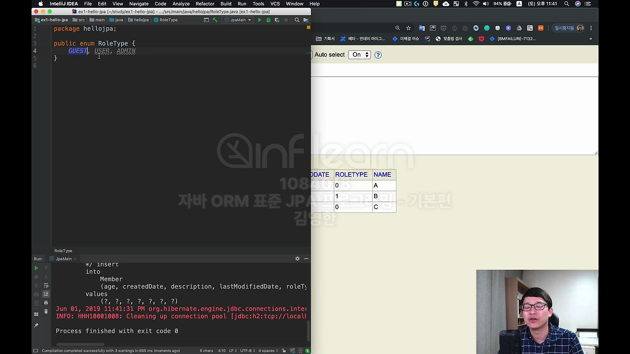 그 다음에 db를 보시면, RoleType이 guest로 들어가 있죠. enum의 문자 그대로 들어가는 거죠. 몇 자 아끼려다가 큰 장애를 내는 것보다는 데이터를 조금 더 쓰더라도 요즘 DB도 빵빵하고 다 좋아서 그냥 String을 쓰시는 게 맞아요. 이렇게 하고 GUEST, ADMIN을 하면 다음에 별도의 데이터 타입이 추가되어도 순서에 의한 문제가 없기 때문에 잘 동작하게 됩니다.