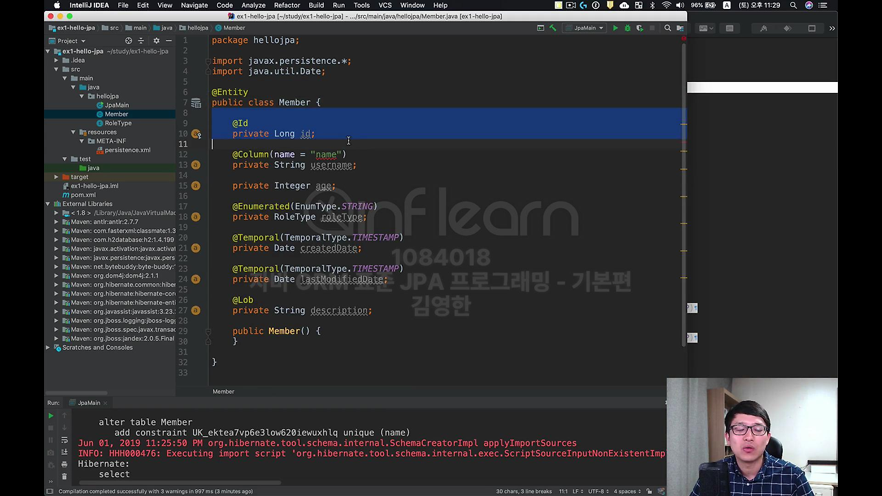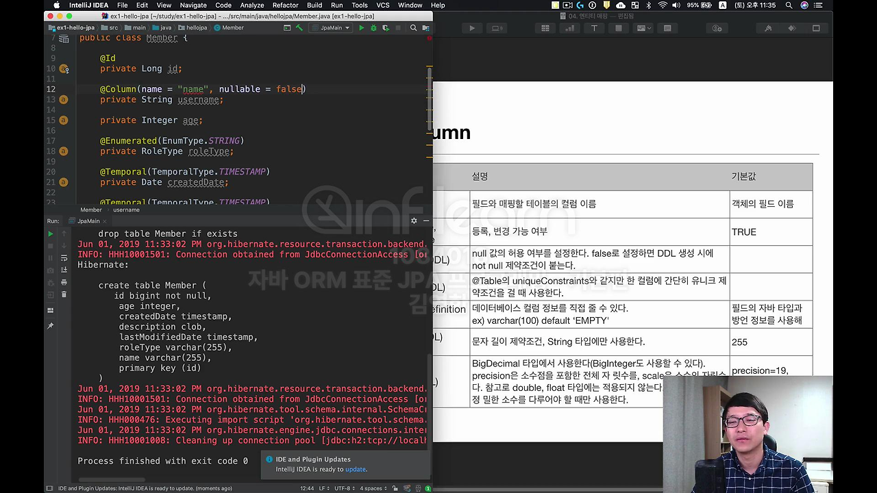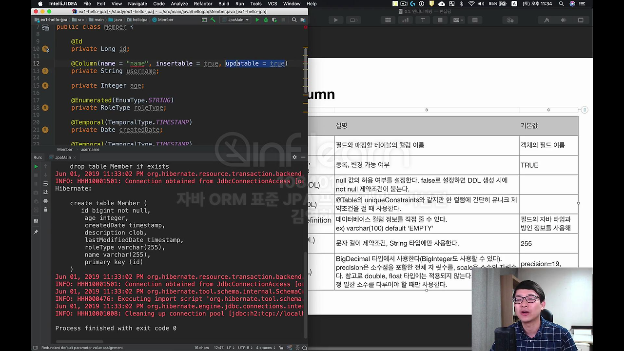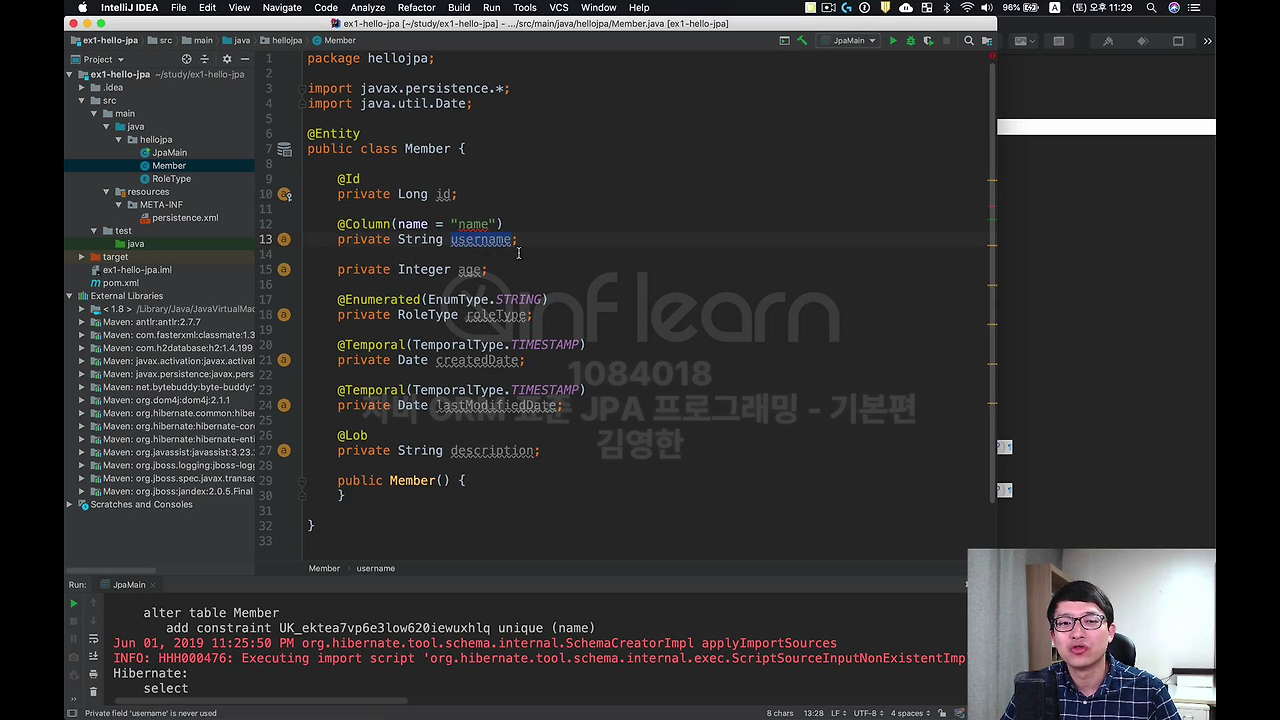이렇게 하면 사실 필드랑 컬럼 맵핑이 끝나는 거에요. 생각보다 몇 개가 없죠. 이 정도만 해서 보면 별로 어렵지 않은 거에요. 물론 이제 진짜 어려운 거는 나중에 뒤에 가서 연관관계를 맵핑하는 게 어려운데요. 기본적으로 맵핑해서 쓰는 것 자체는 굉장히 간단합니다.