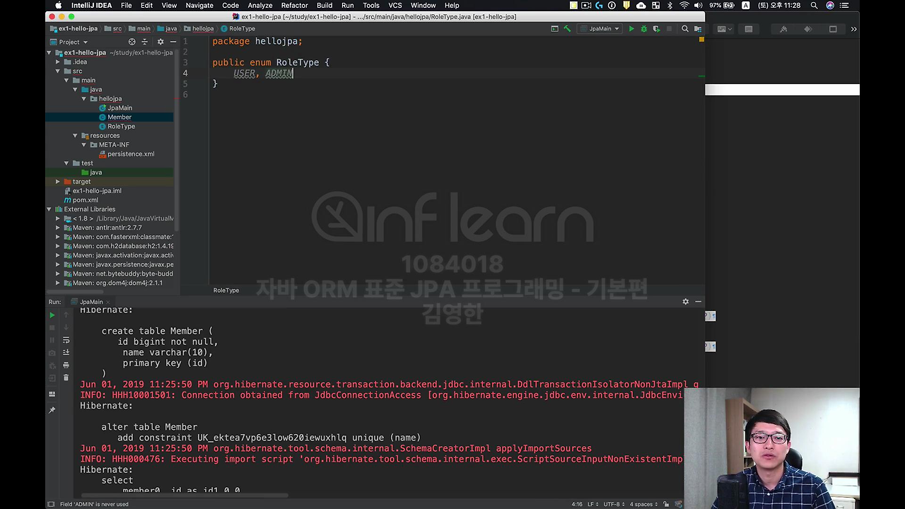 원래는 BLob, CLob이 있는데 여기 보시면 @Lob 이라고 해놓고 이게 문자(String) 타입이면 CLob으로 생성이 됩니다. 기본이 맵핑이 그렇게 됩니다. 그 다음에 lastModifiedDate(최종 수정 시간)이 있고, RoleType 을 보면 varchar(255)로 되어있죠. name도 varchar구요.