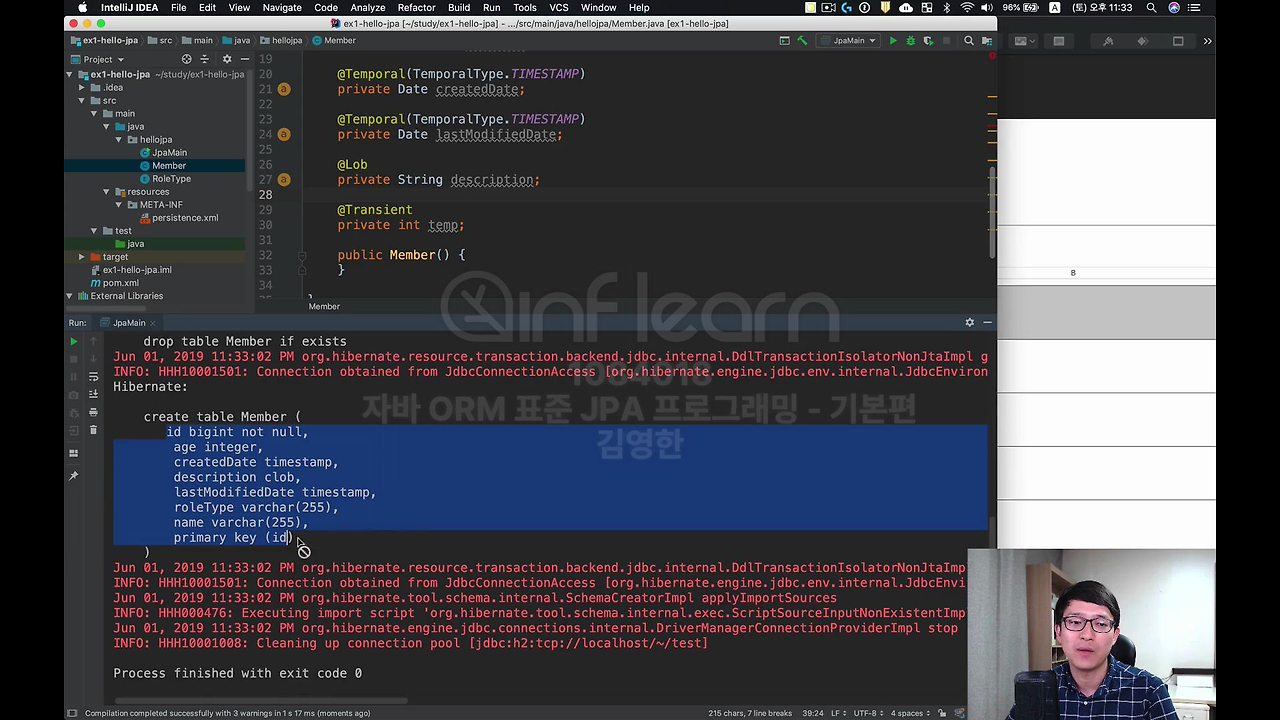 실행하면 여기 보시면 temp가 없죠. 그래서 @Transient는 특정 필드를 컬럼에 매핑하지 않겠다는 겁니다. temp는 그냥 메모리에서만 쓰겠다는 거죠. 그럴 수 있잖아요. 메모리에 임시로 계산해 두고 뭔가 캐시 데이터를 넣어 두거나 그럴 때요.