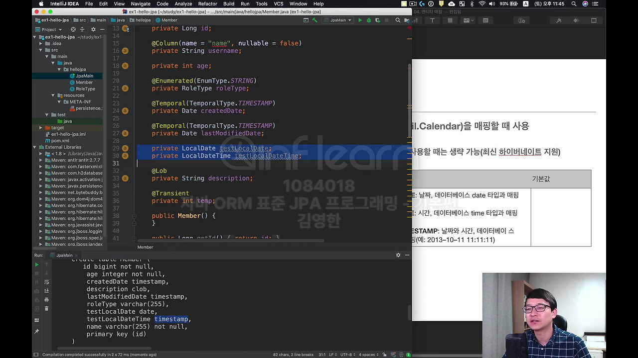예를 들어서 private LocalDate, LocalDate는 말 그대로 연, 월 데이터 까지만 있는 거죠. 그래서 그냥 이렇게 필드명을 붙이고요. LocalDate는 연, 월만 있는 거구요. LocalDateTime은 연, 월, 일이 다 포함되어 있는 데이터입니다. 이렇게 쓰시면 Hibernate 에서는 그냥 이 어노테이션 없어도 어차피 타입을 보면 아니까,
