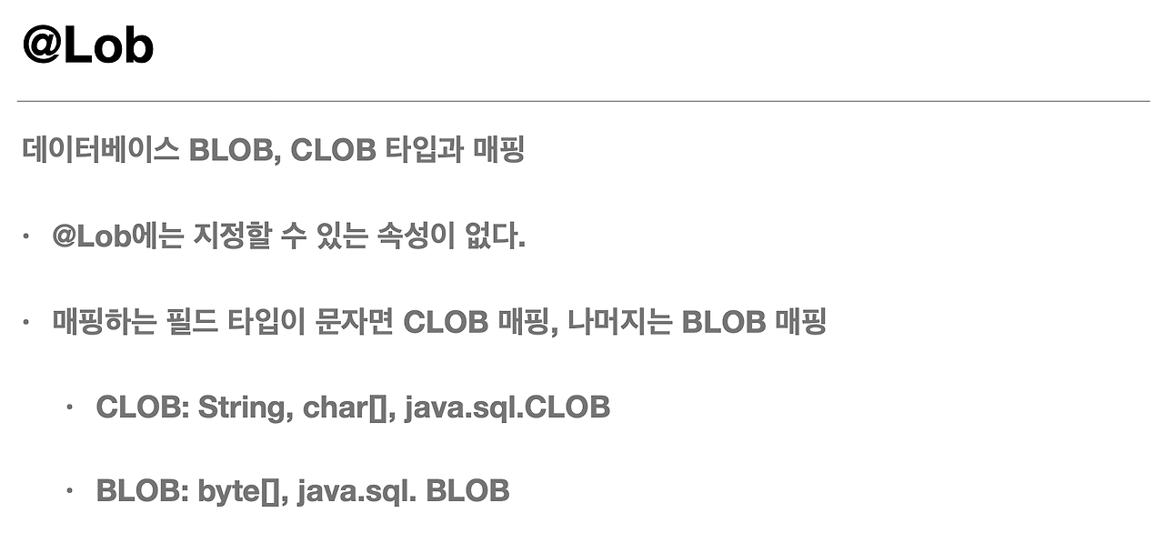 그 다음에 이제 CLob, BLob 이런거 아시죠. 그 데이터베이스에 뭔가 Varchar를 넘어서는 굉장히 큰 컨텐츠를 넣고 싶으면 이제 Lob을 쓰시면 되구요. @Lob 해서 쓰시면 됩니다.