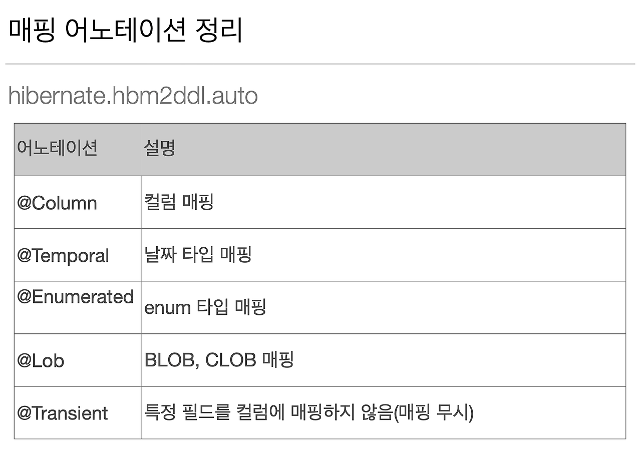 자 그래서 @Column은 Column 맵핑, @Temporal은 날짜 맵핑 이렇게 뭐 쭉쭉 말씀드린 것들이 있구요.