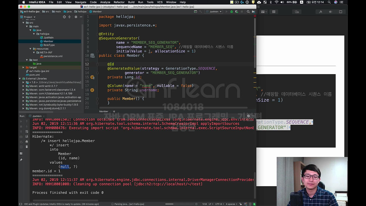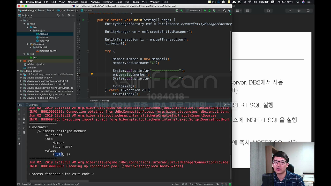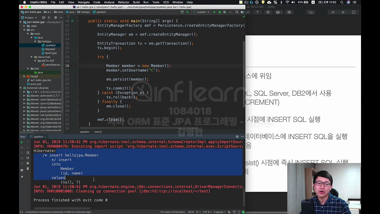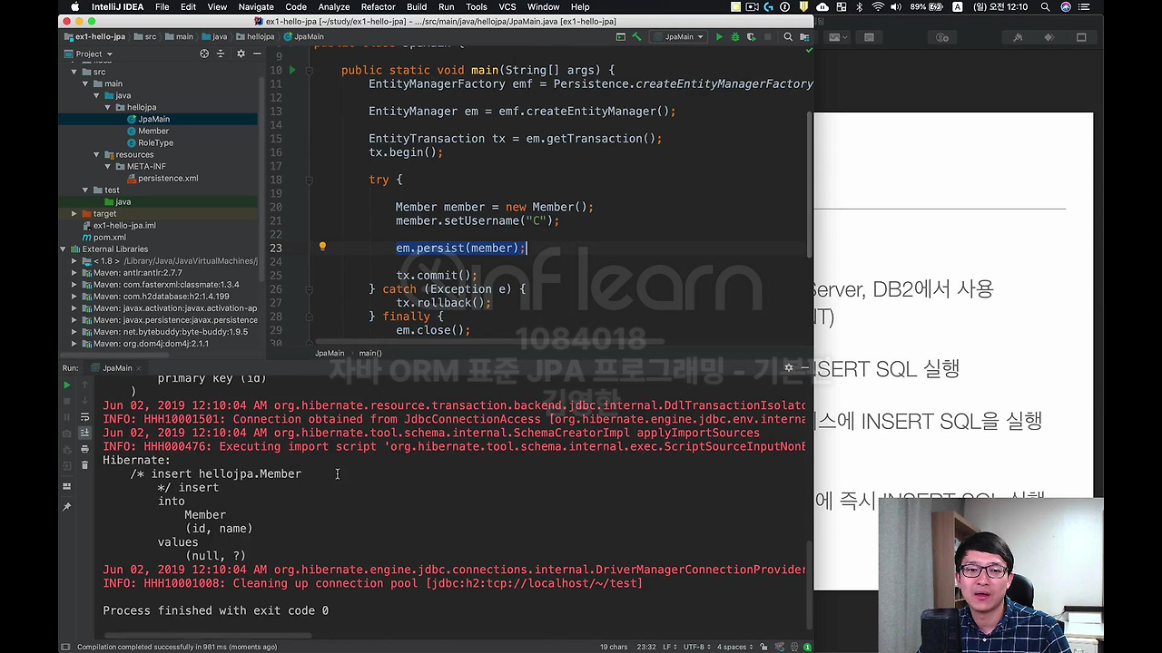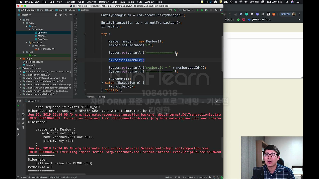 보시면 id = 1 나오죠. 그니까 em.persist 하는 시점에 일단 DB에 집어넣고, DB가 1을 생성하잖아요? 그 Generate Value, Auto Increment가 뜨면서 DB가 생성한 값을 select 해서 읽어옵니다.