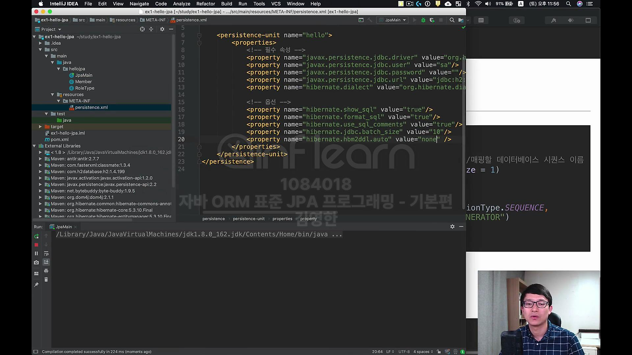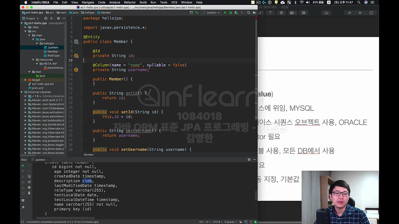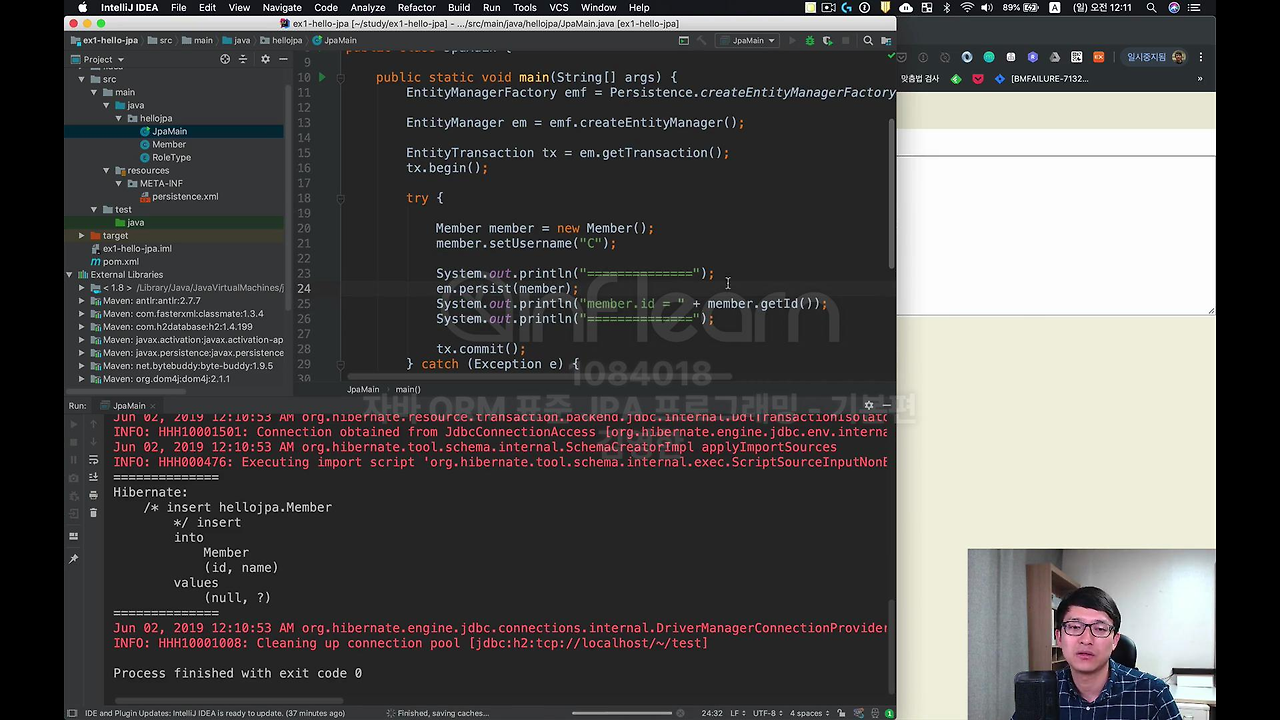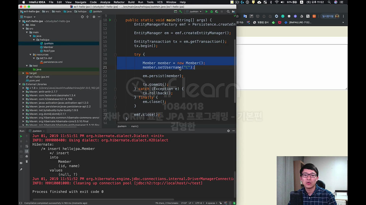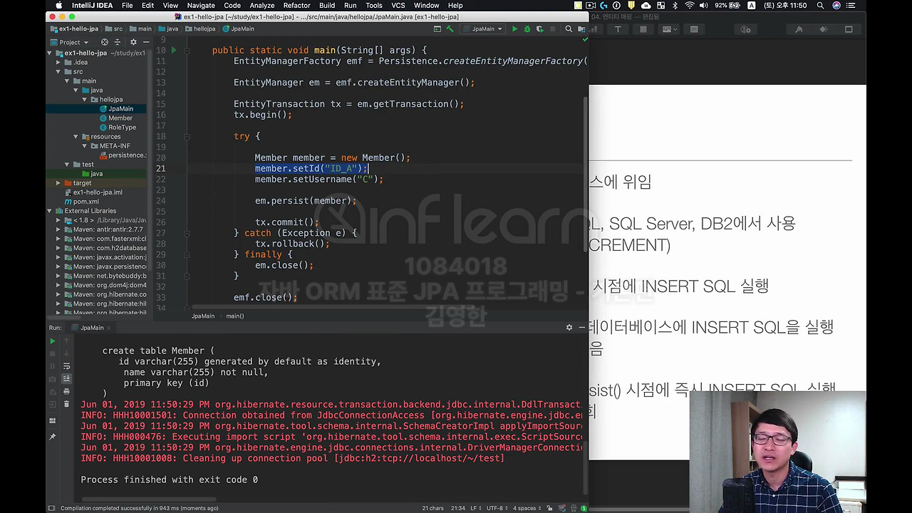 보시면 id = 1 나오죠. 그니까 em.persist 하는 시점에 일단 DB에 집어넣고, DB가 1을 생성하잖아요? 그 Generate Value, Auto Increment가 뜨면서 DB가 생성한 값을 select 해서 읽어옵니다.
