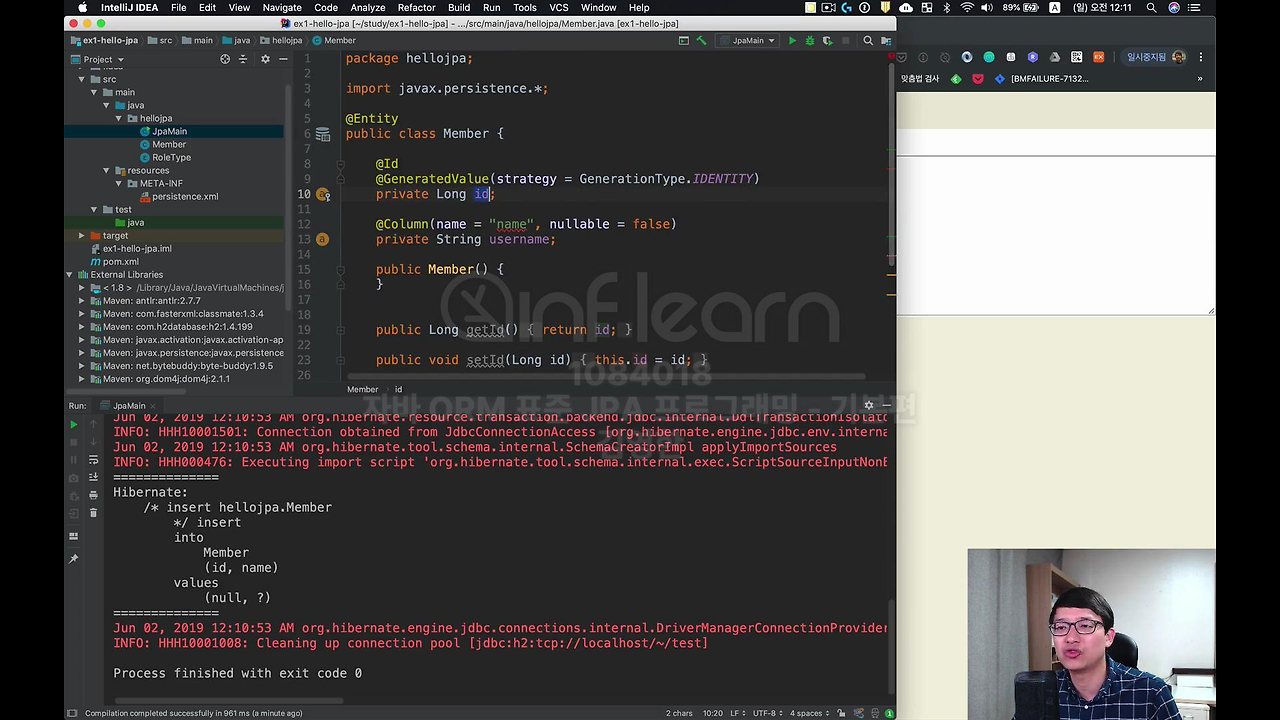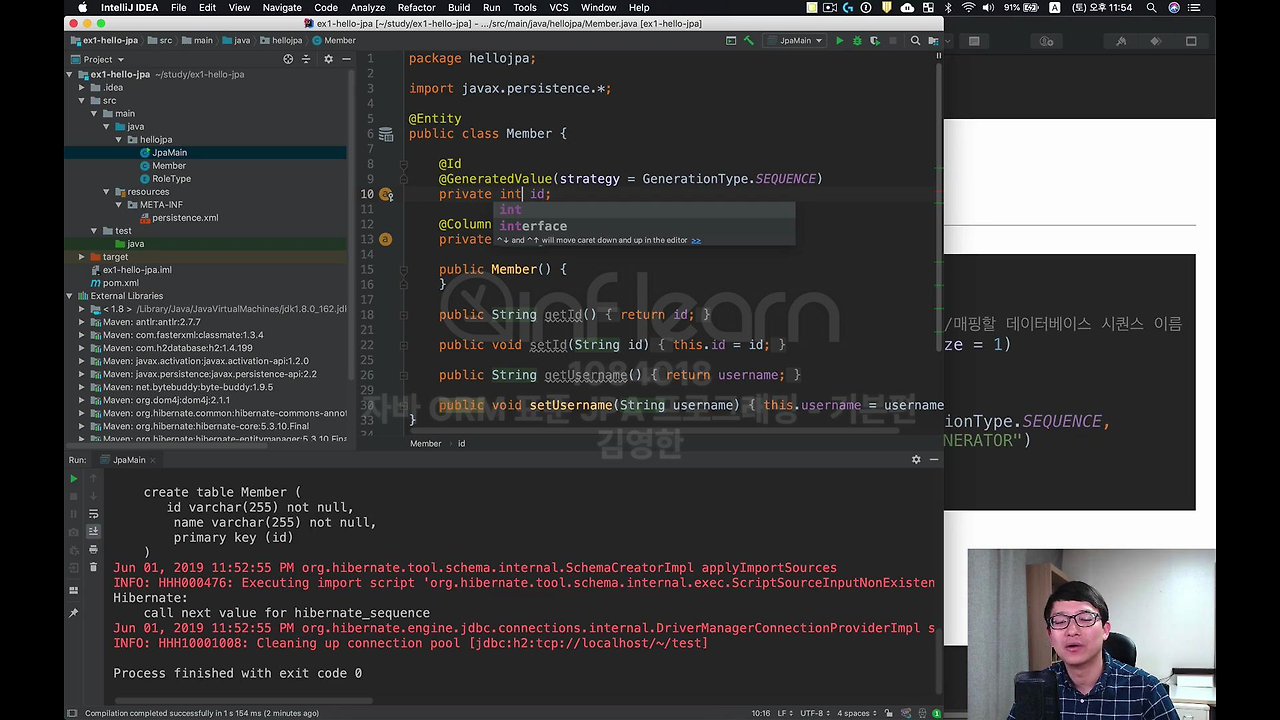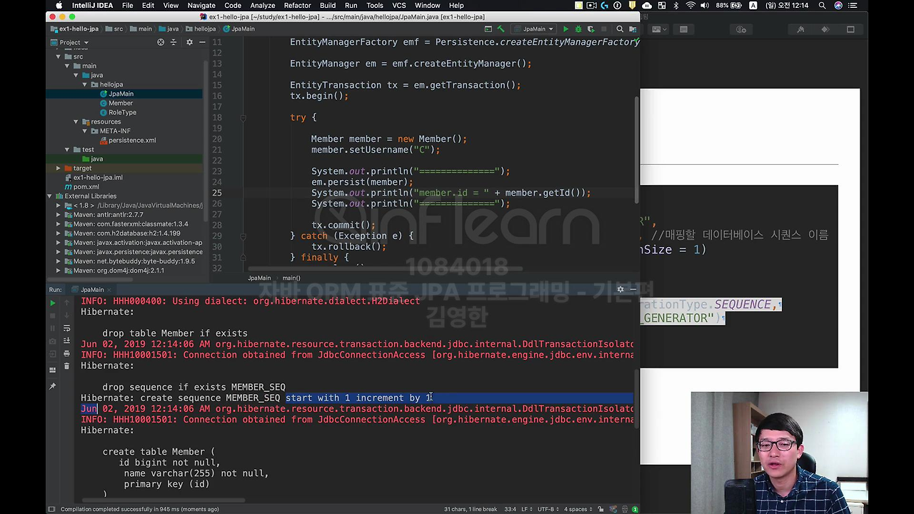 Member 객체를 생성을 하고 그 다음에 id 값은 당연히 세팅을 하면 안 되죠. 왜냐면 지금 generator value에서 Sequence 전략.