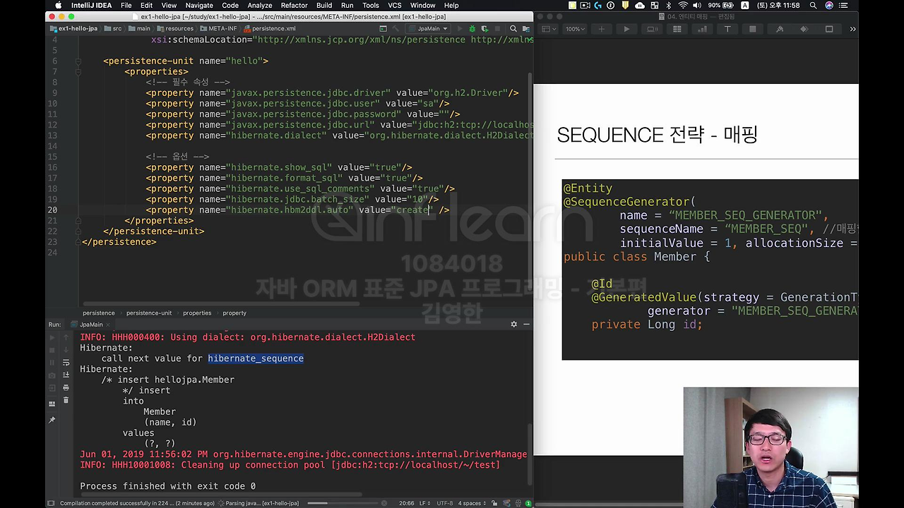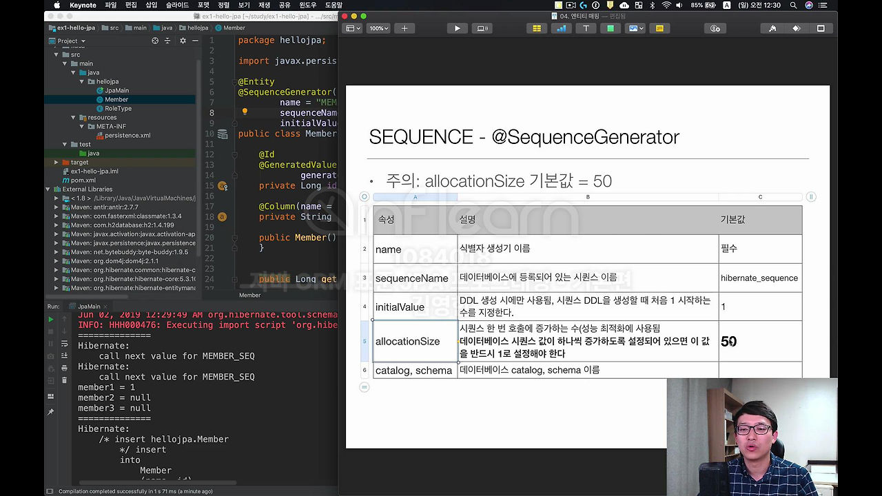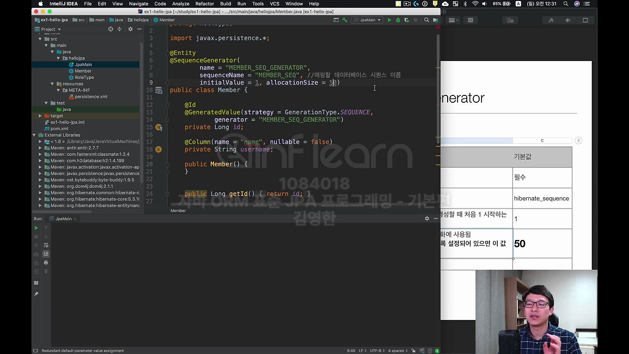 그러면 이렇게 @SequenceGenerator 라는 걸 가지고 맵핑을 하시면 됩니다.