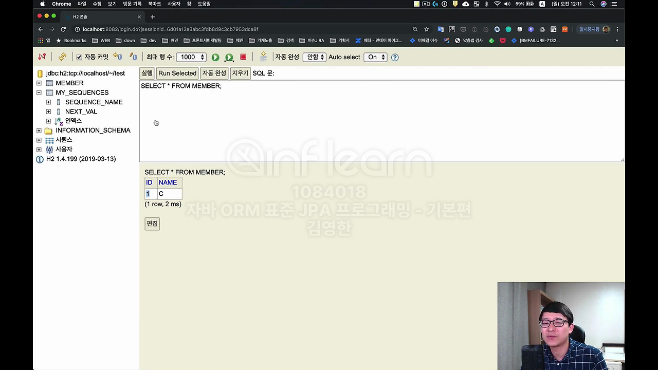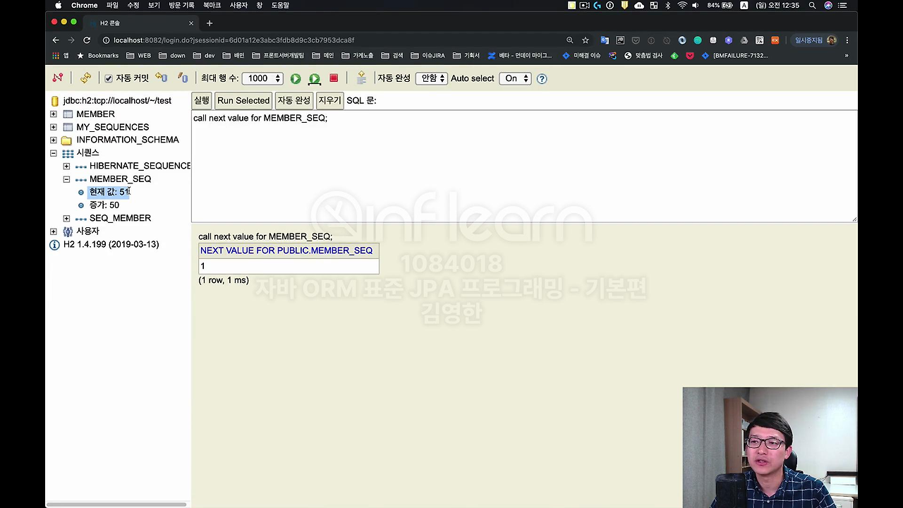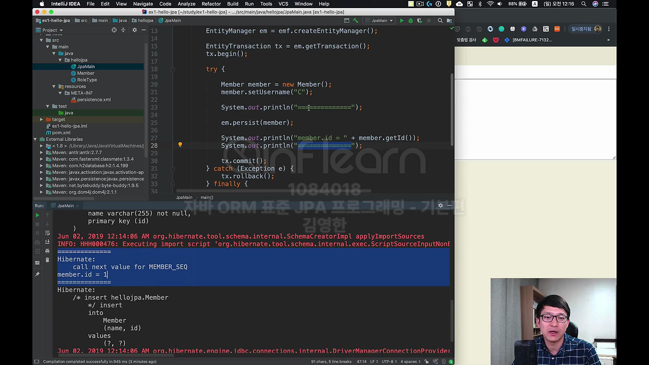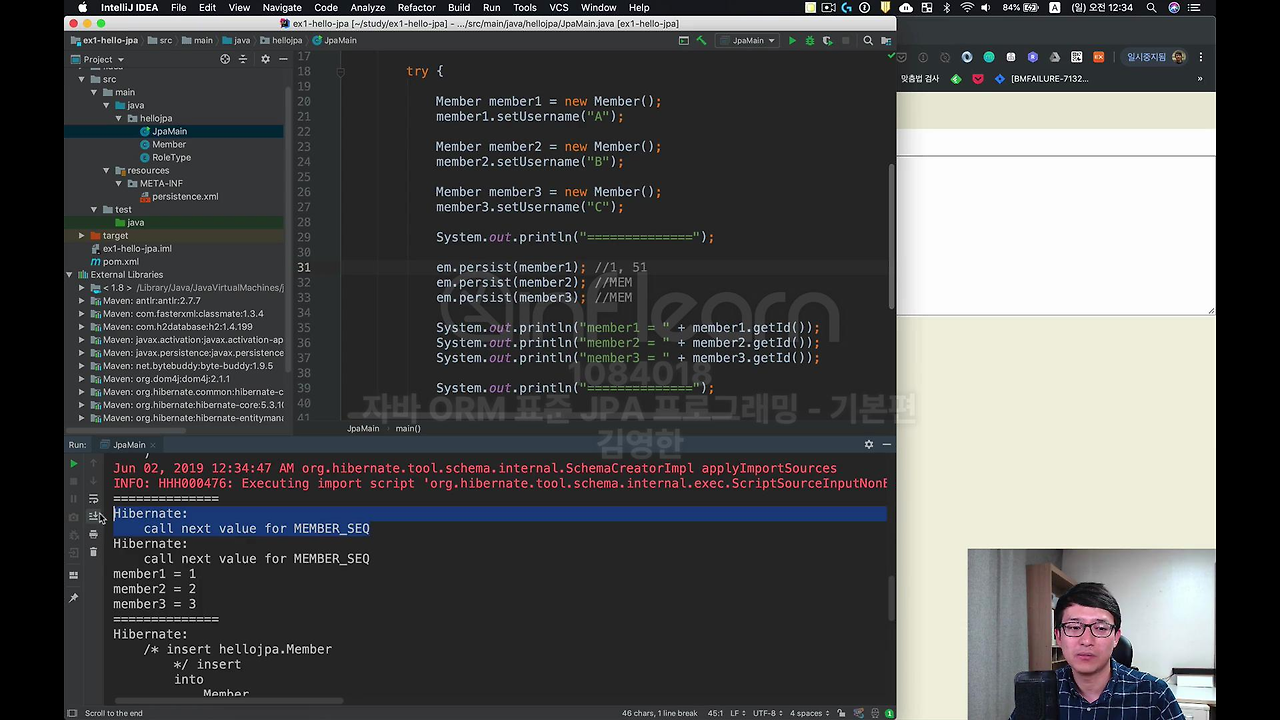 자 이 사이에 있는 call next value for MEMBER_SEQ 라고 해서 쿼리가 나가는 게 보이시죠? '데이터베이스에 있는 MEMBER_SEQ 한테 다음 값 내놔!' 라고 한거에요. 그게 현재 값 1이고요. 다음에 호출하면 2가 될 거에요. 그래서 이 1 값을 얻어 가지고