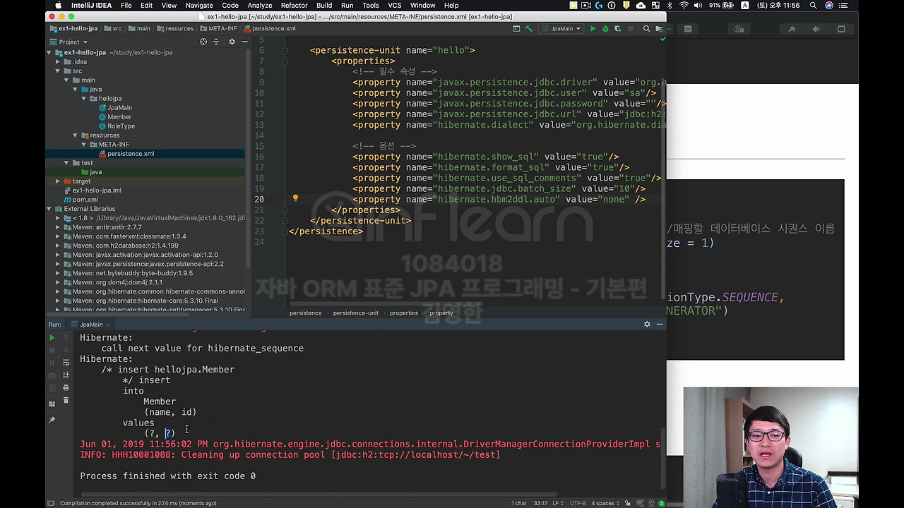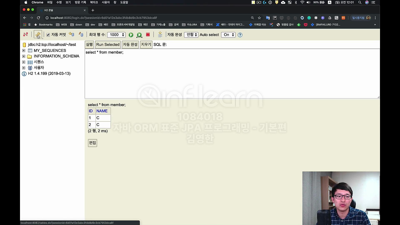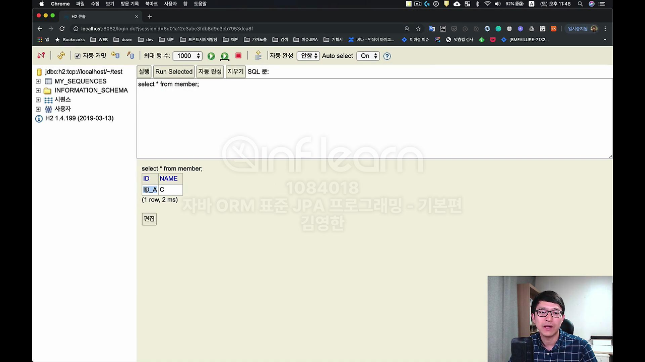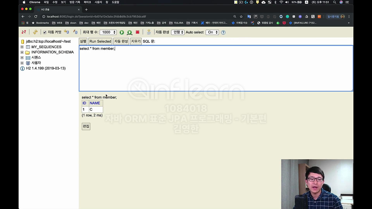 자 이 사이에 있는 call next value for MEMBER_SEQ 라고 해서 쿼리가 나가는 게 보이시죠? '데이터베이스에 있는 MEMBER_SEQ 한테 다음 값 내놔!' 라고 한거에요. 그게 현재 값 1이고요. 다음에 호출하면 2가 될 거에요. 그래서 이 1 값을 얻어 가지고