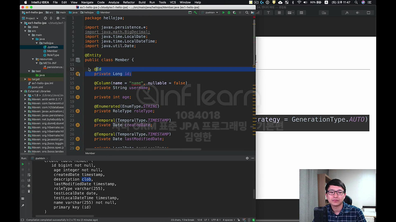 그리고 사용할 수 있는 annotation은 크게 두 가지가 있습니다. @Id랑 @GeneratedValue 자 이제 하나씩 설명을 드릴게요.